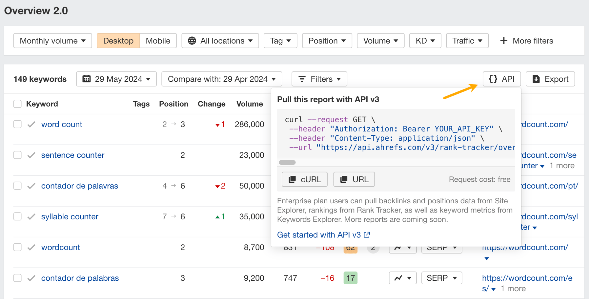 As always, you can use the API button in the reports to create request URLs for filters you’ve applied.