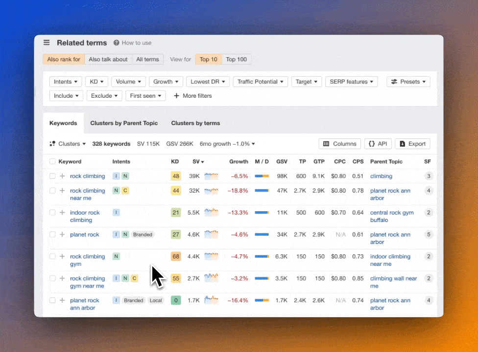 Need to find trending keywords that are hot in your industry over the last few months? Use the Growth metric.
