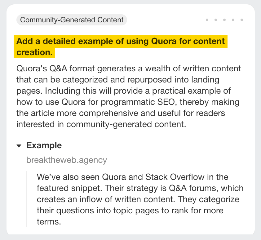 AI Content Grader also shows you suggestions on how to best cover subtopics, word-for-word, by providing a real-life example from a top-ranking page.