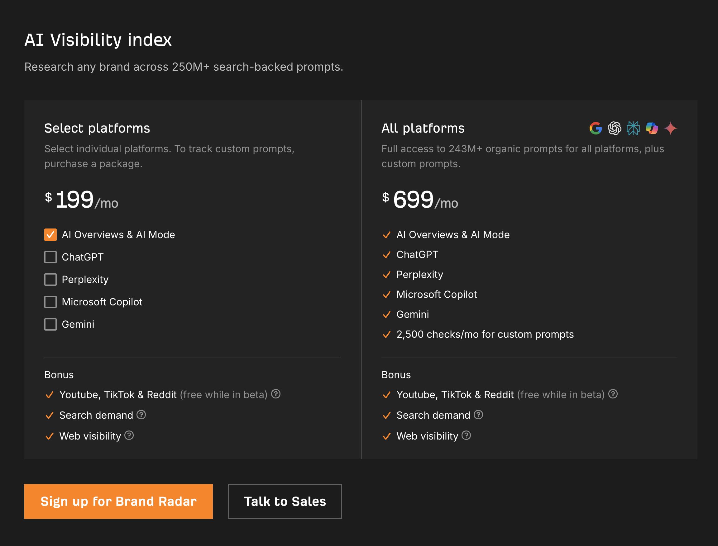 Brand Radar’s AI platform indexes are separate stand-alone purchases, and do not require a base subscription plan. No base subscription plan comes with the AI platform indexes included.