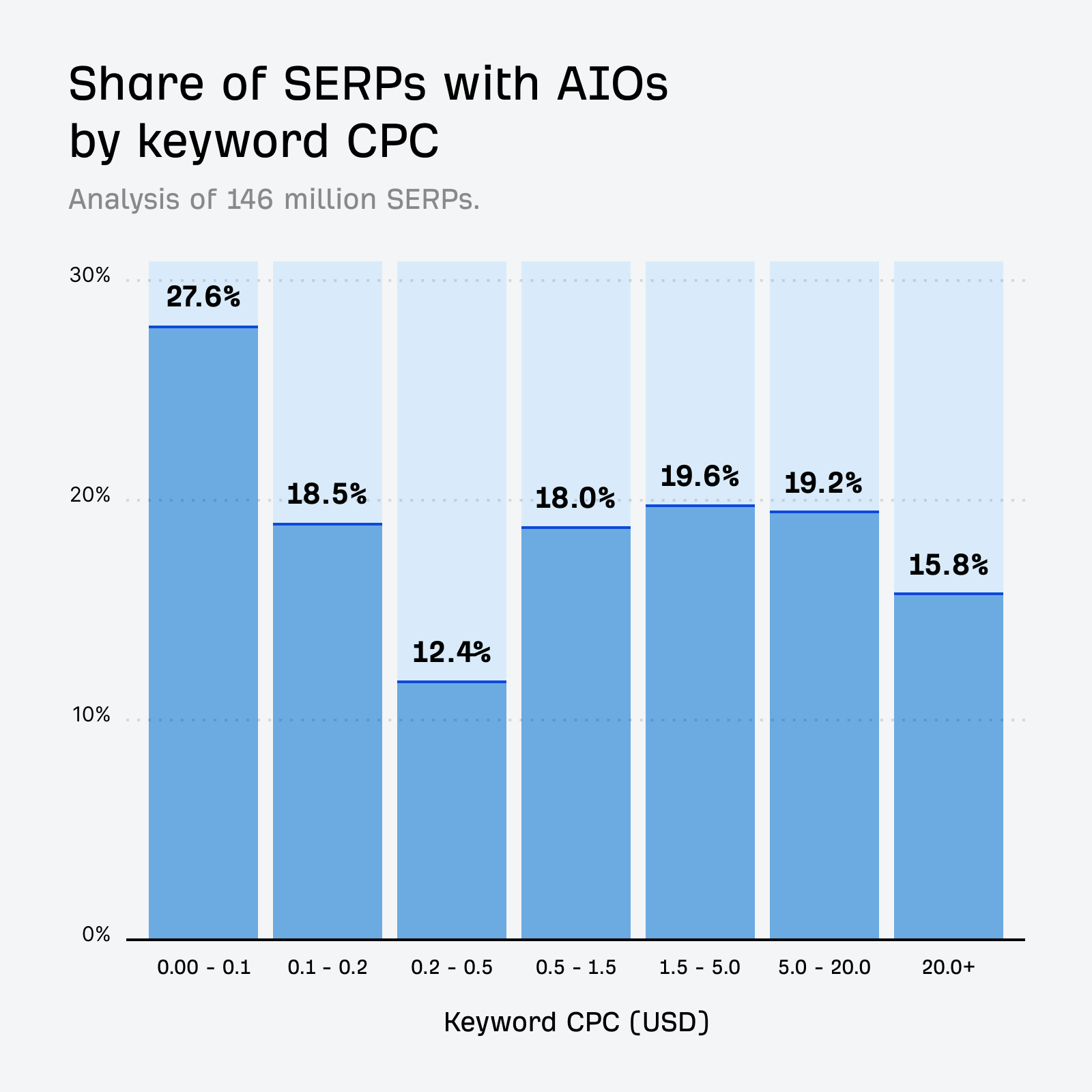 There seems to be little obvious correlation between keyword CPC buckets and AI Overview appearance, with most hovering within a couple of percentage points of our 20.5% baseline: