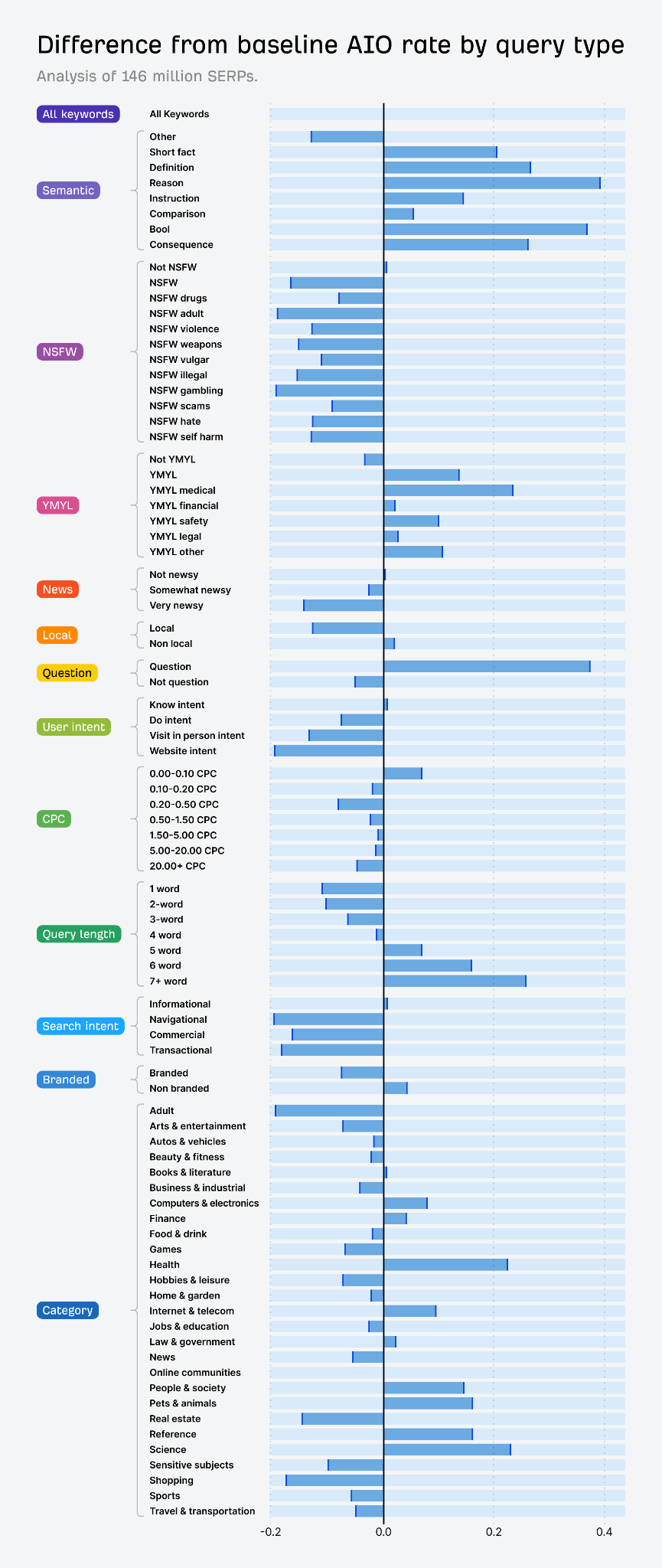 Here’s a chart summarising our findings. Query types with a positive difference from the baseline (i.e. bars on the right of the mid-line) are more likely to trigger an AI Overview; those with a negative difference (bars on the left) are less likely to trigger an AI Overview.
