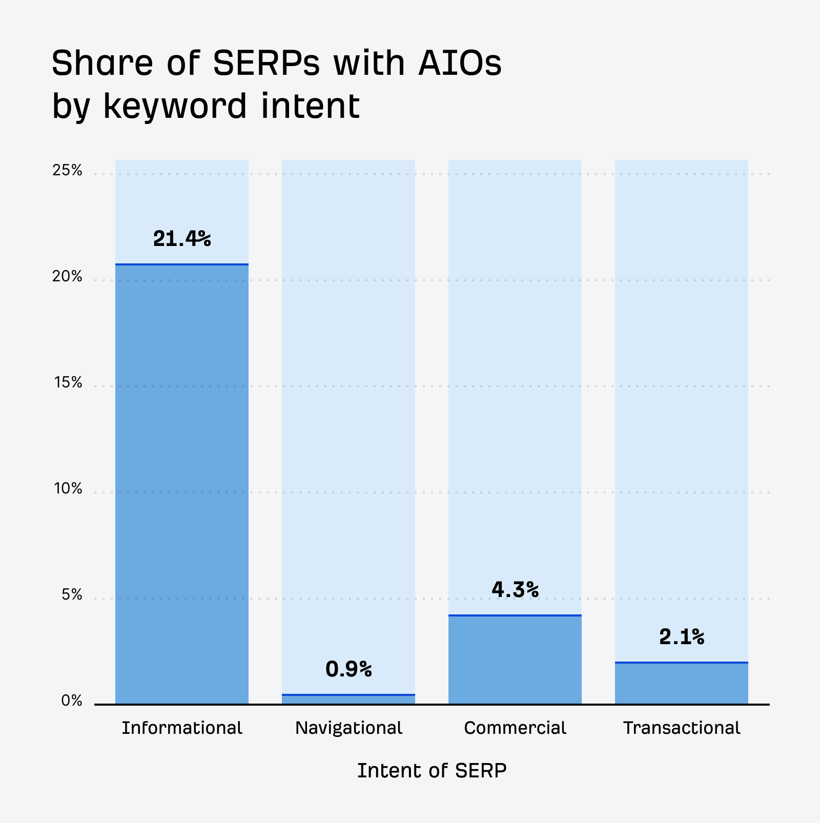 99.9% of keywords that trigger AI Overviews are Informational in intent. 5.5% of AIO keywords are considered Commercial, 1.2% Transactional, and just 0.1% Navigational.