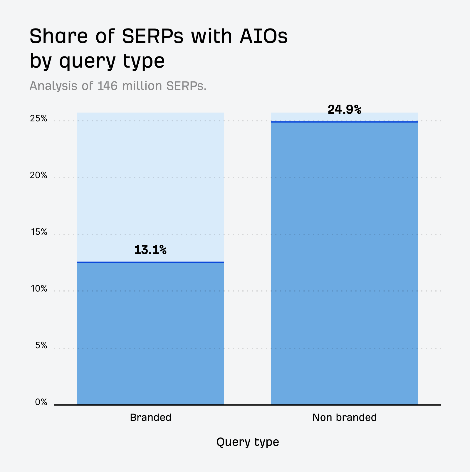 AIOs are 1.9x more likely to appear on non-branded queries, triggering on 13.1% of all branded queries and 24.9% of non-branded queries in our SERP database.
