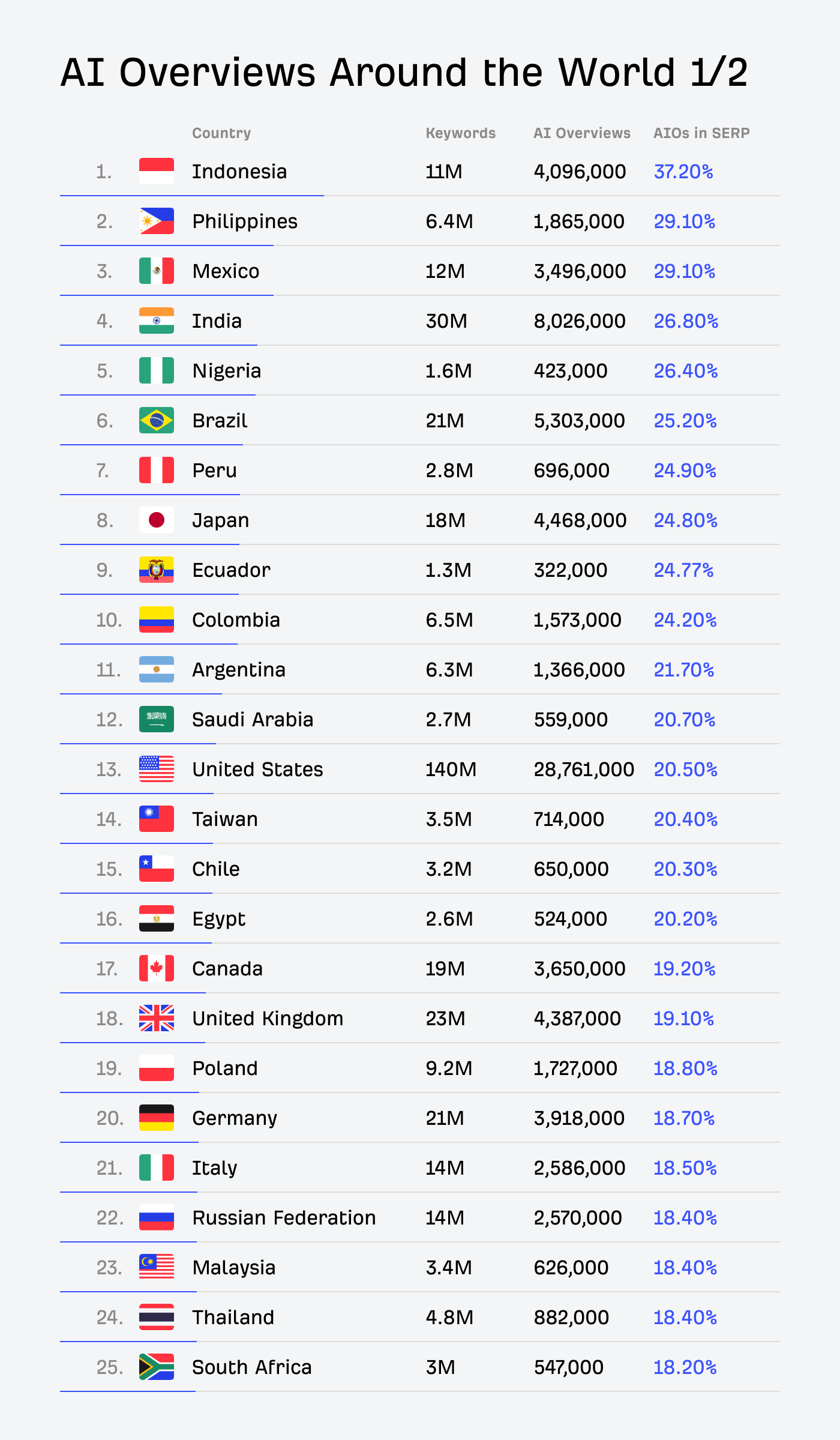 If you expected the US to be in the top 10, you might be surprised. Right now, the clear leader is Indonesia, with AIOs appearing for 37.2% of all keywords, followed by the Philippines and Mexico (29.1%), India (26.8%), and Nigeria (26.4%).