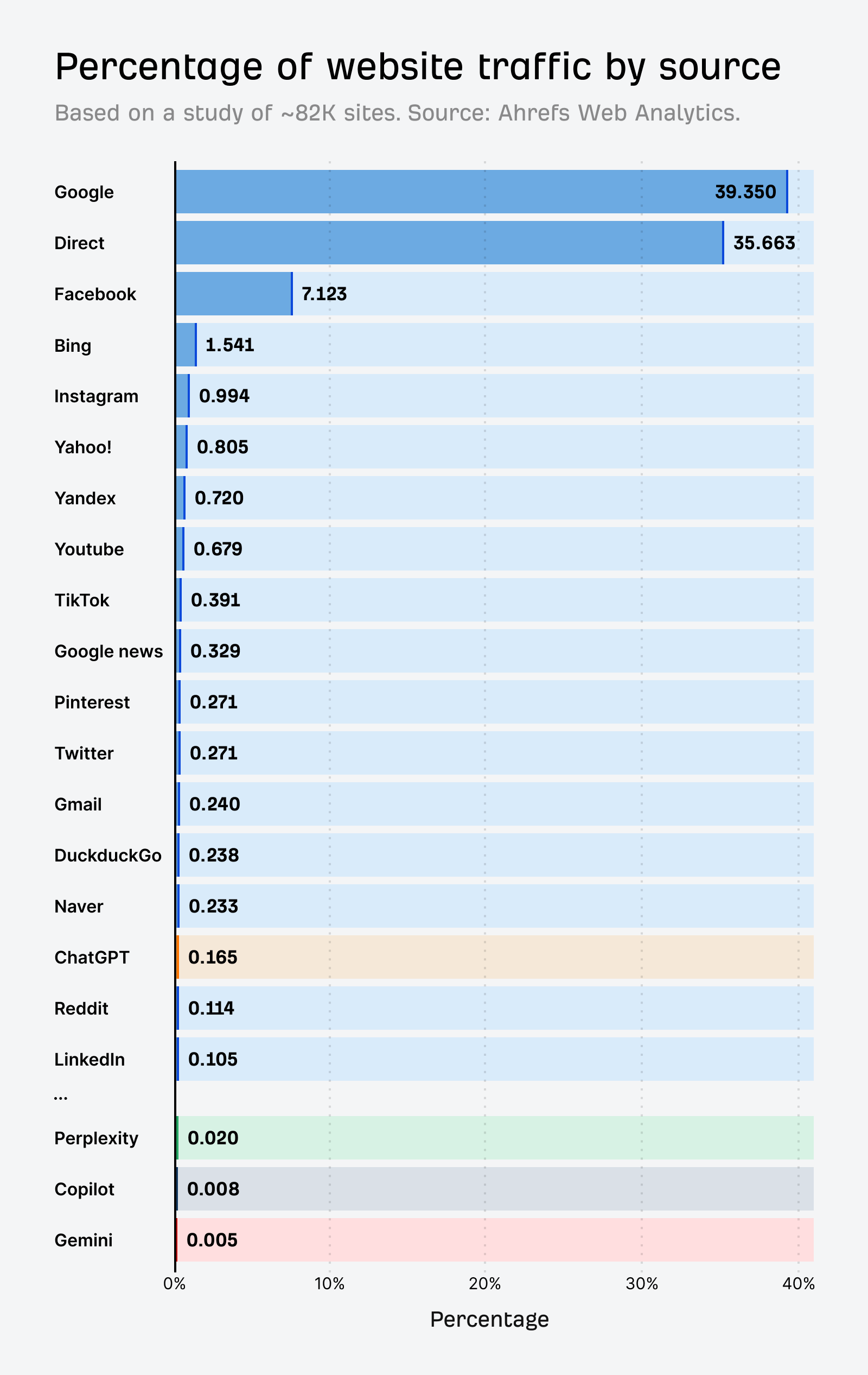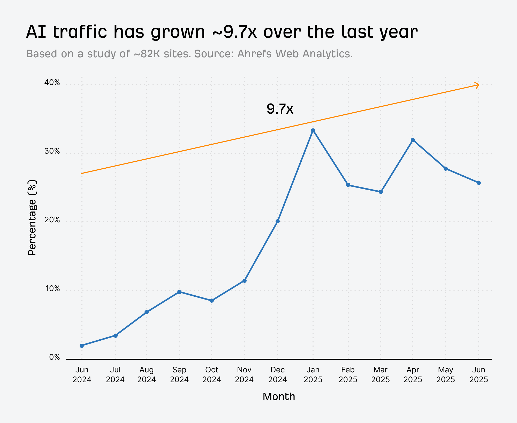 With the help of Xibeijia, Ahrefs’ awesome data scientist, we’ve analyzed 81,947 sites (up from ~35K sites in March), to understand more about AI traffic today.