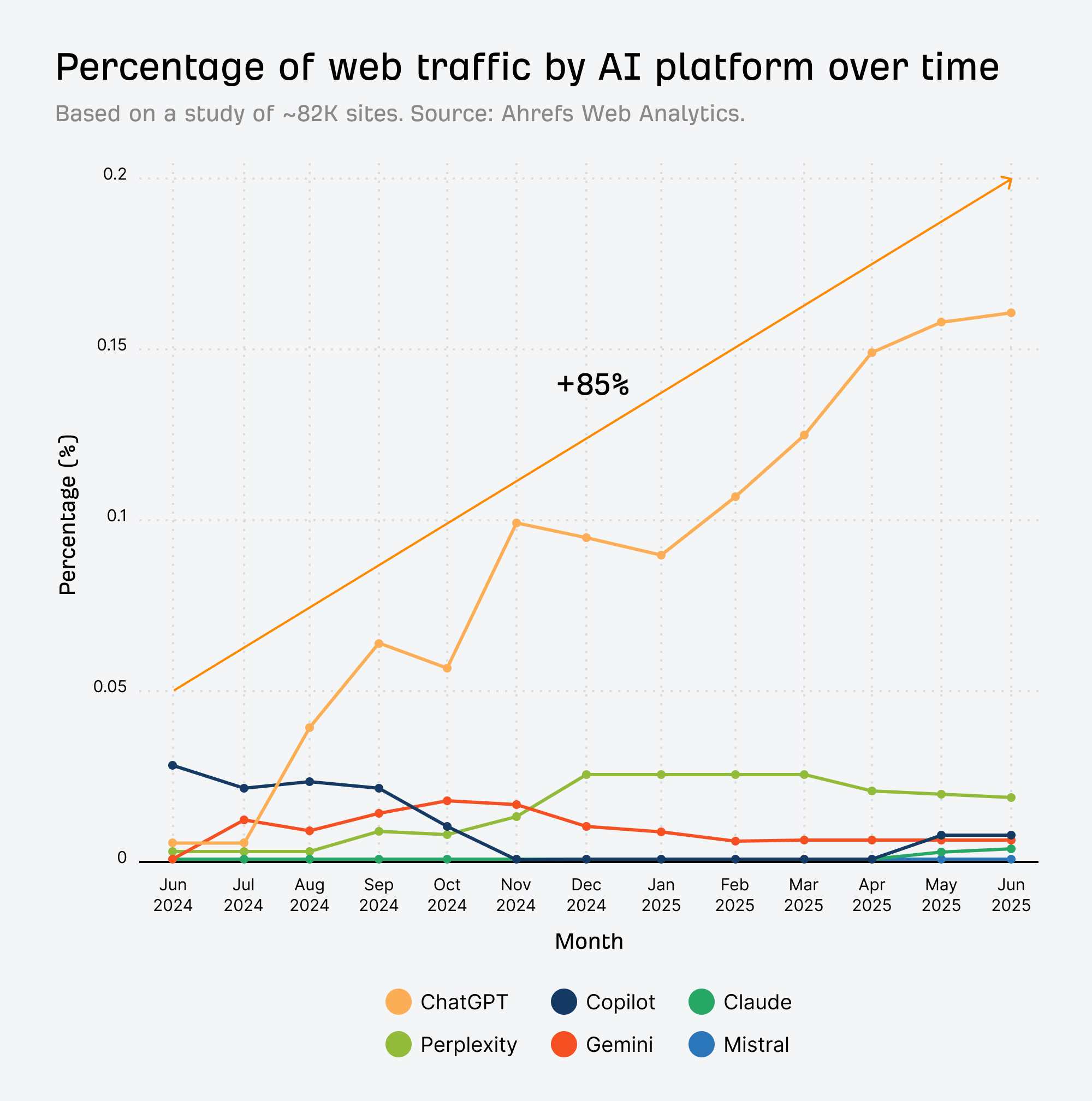 ChatGPT has driven AI traffic growth almost single-handedly, growing 85% since January.