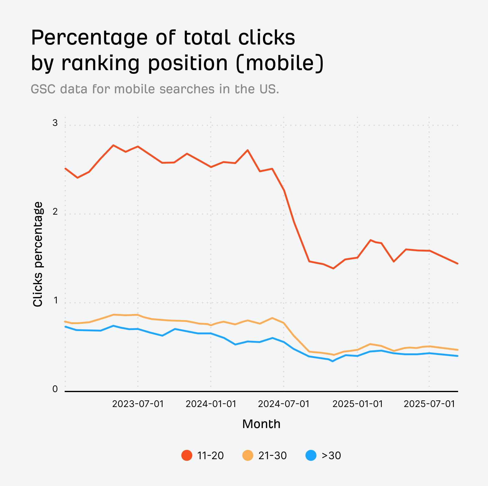 Given that clicks for URLs beyond position 30 are almost nonexistent, it’s likely that these impressions are registered by bots and scrapers.