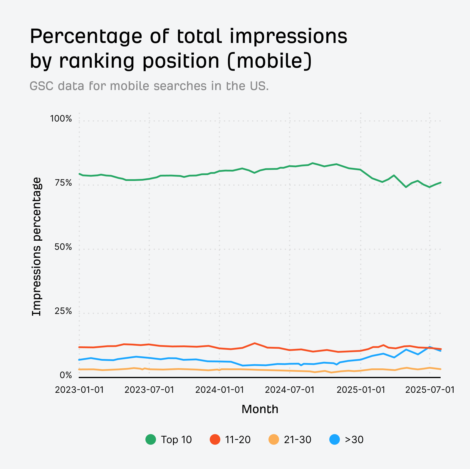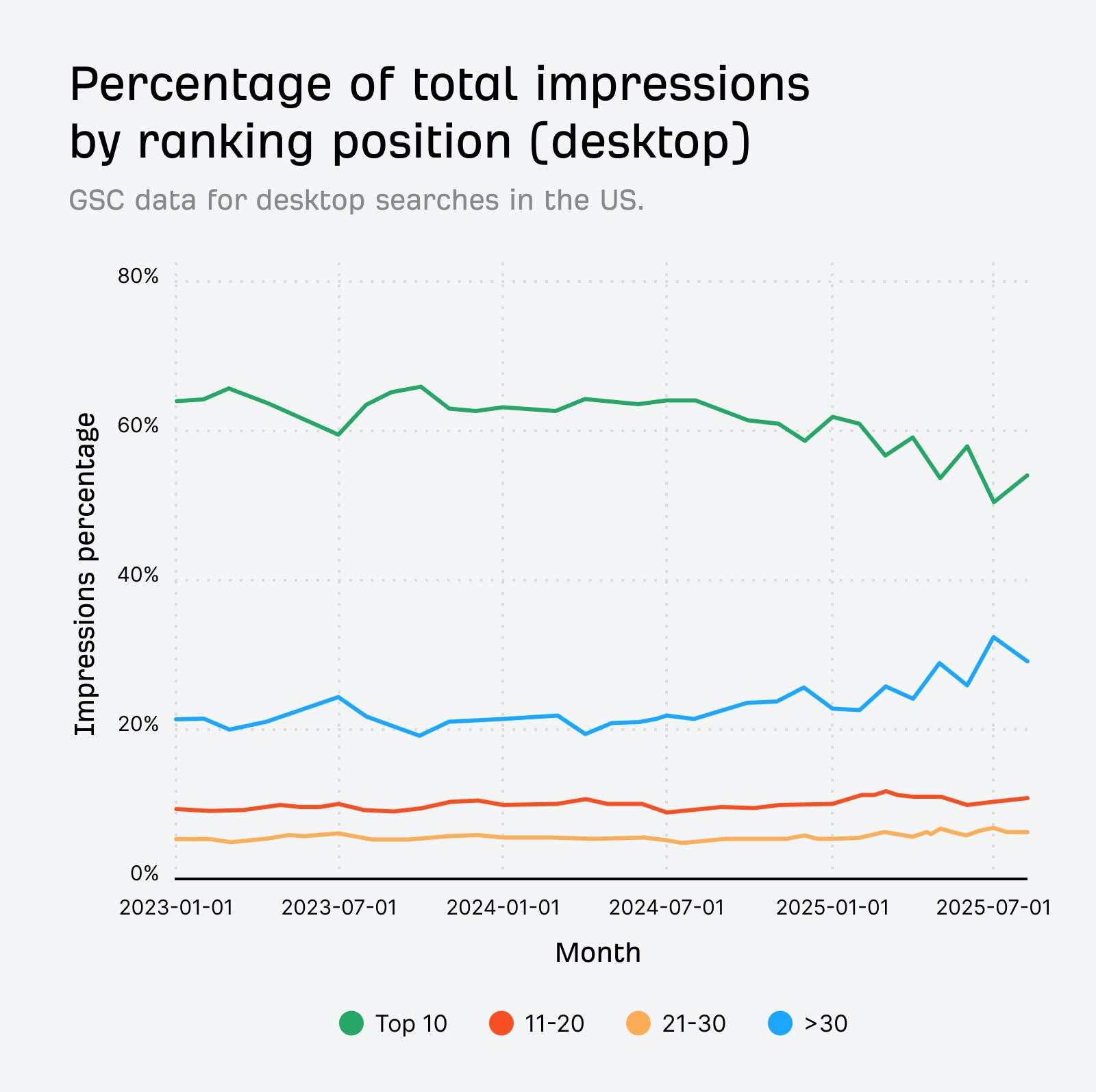 Looking at the historical trend, impressions for URLs in positions >30 are trending upwards, while impressions in the top 10 show a corresponding drop.