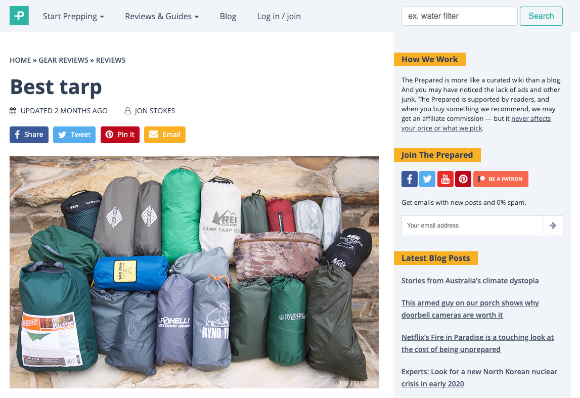 - They can get consistent organic traffic over time. Google tends to favor fresh results for queries like “best tarp” because old posts are out of date and no use to searchers in 2020. By publishing regular, minor updates as new products become available, the guys behind The Prepared can maintain rankings long term.