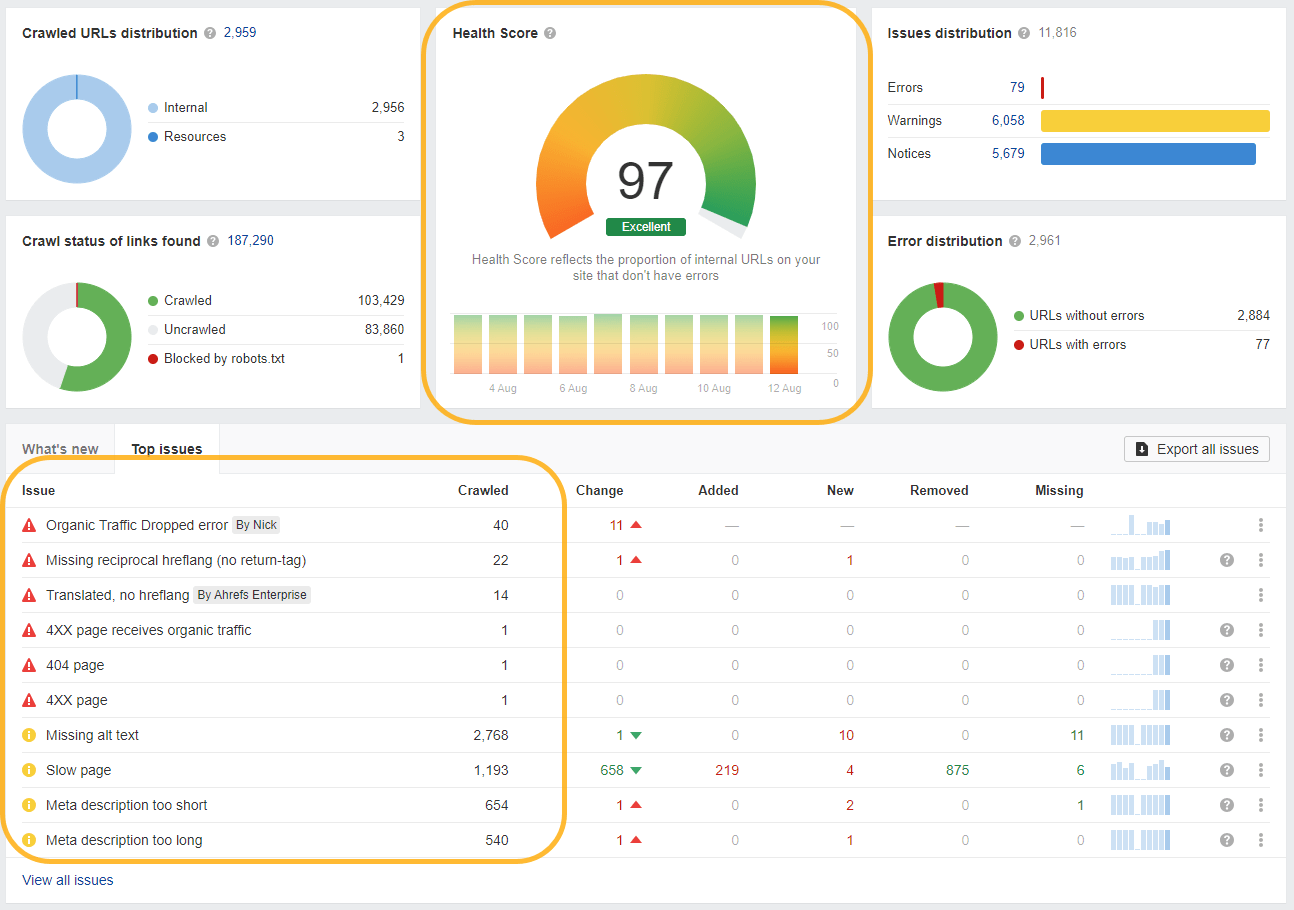 The Site Audit in Ahrefs Webmaster Tools checks your website for over 170 potential technical and on page SEO issues that can harm your website’s performance in search results.