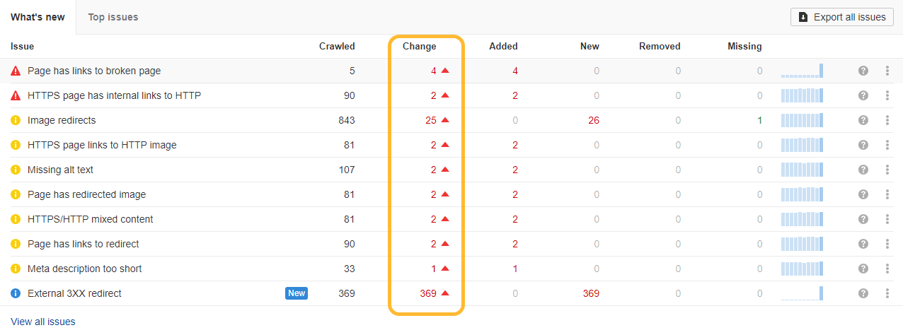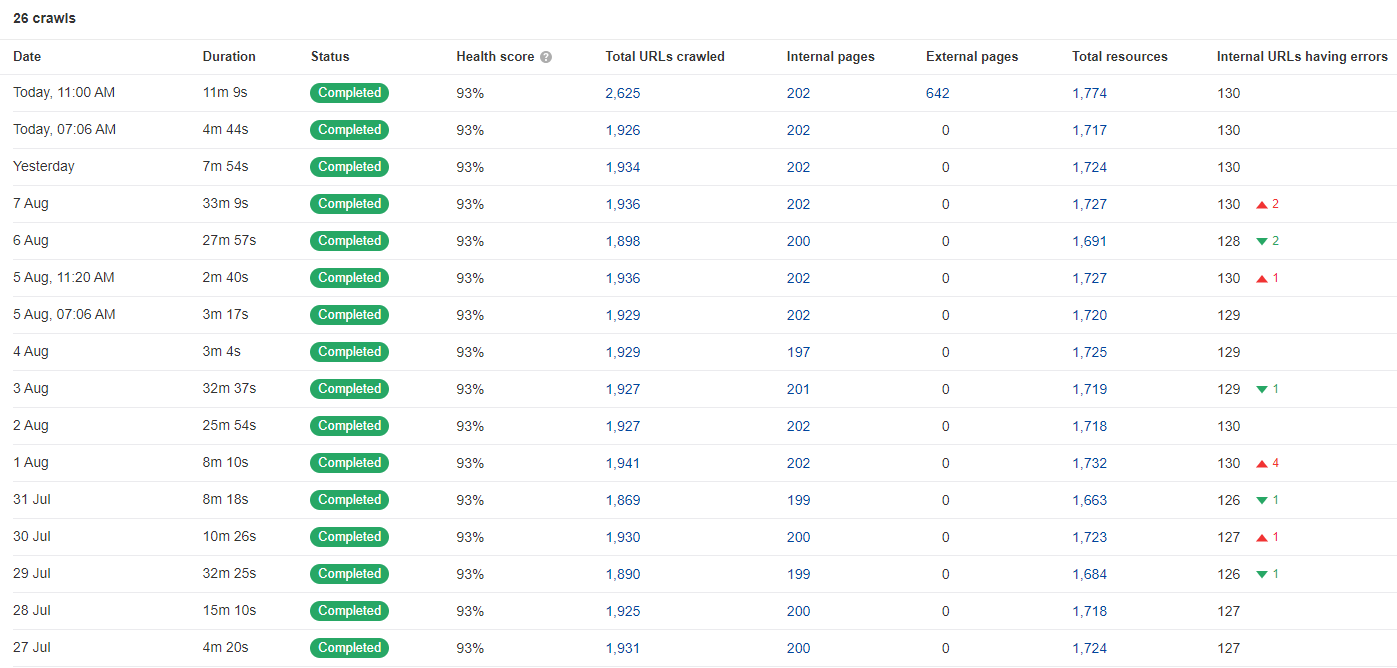 This allows you to access crawls anytime, from anywhere, enabling you to compare them and track which aspects of your website’s SEO have improved or declined over time. Check the Change column for significant deviations.