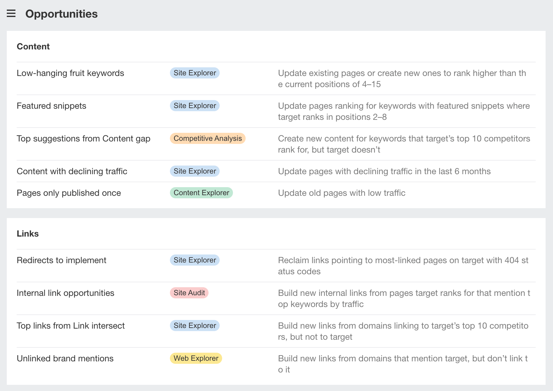 This report pulls from other Ahrefs reports to list the actions that we believe will most help improve your rankings (no more wasting time on things like rewriting 800 meta descriptions!)