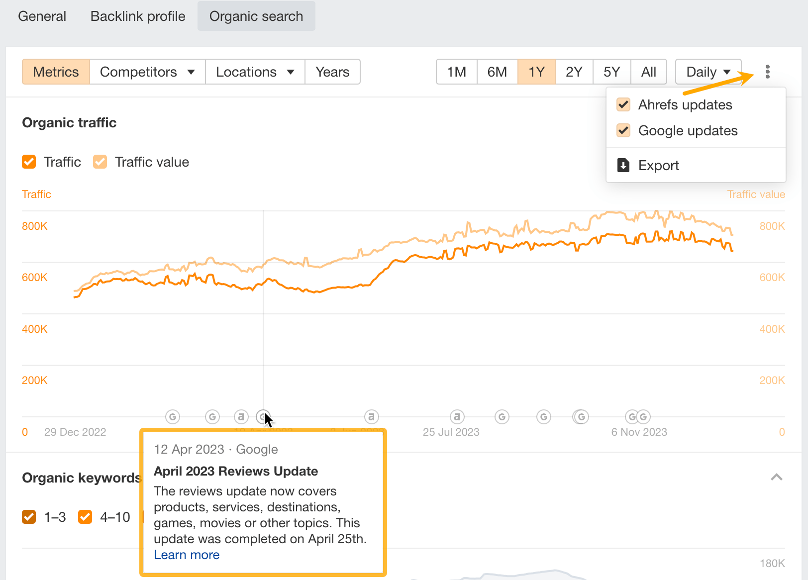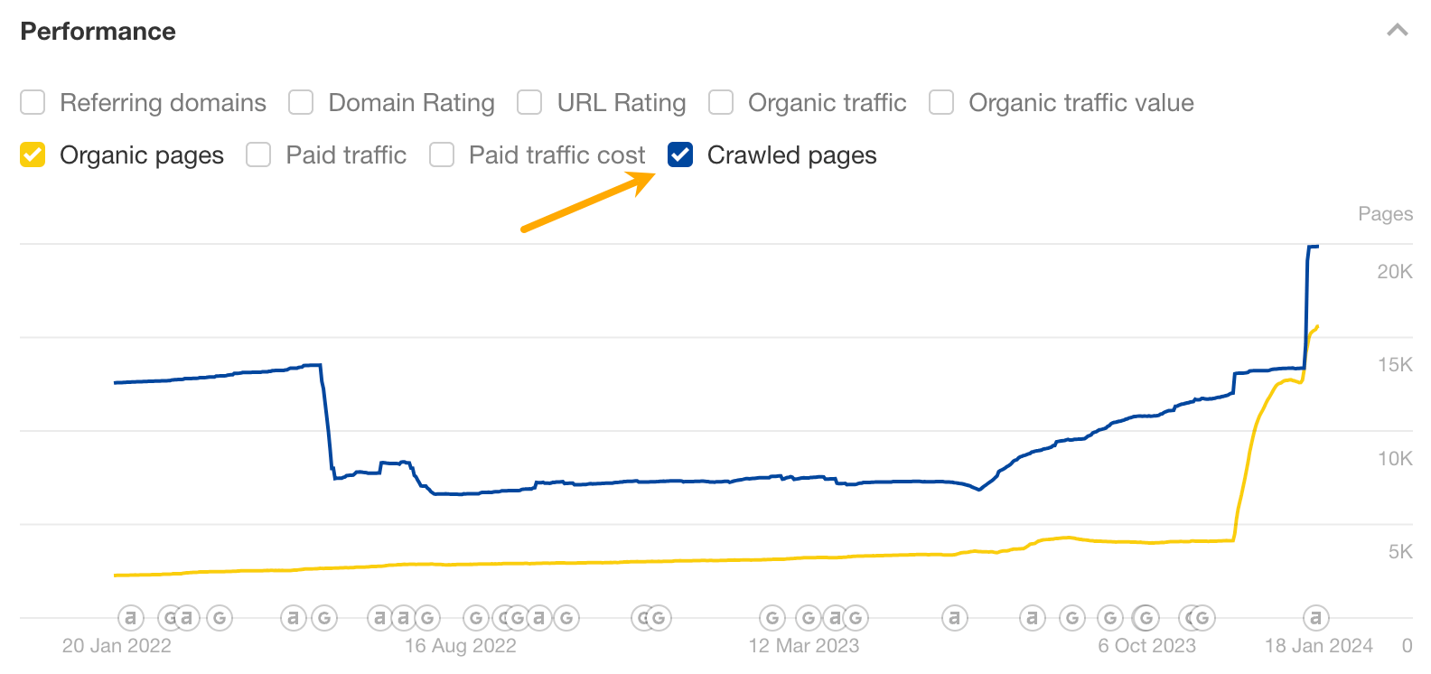 - Chart notes with Google updates: see Google algorithm updates directly on the Performance chart to cross-reference any changes in organic traffic caused by these updates.