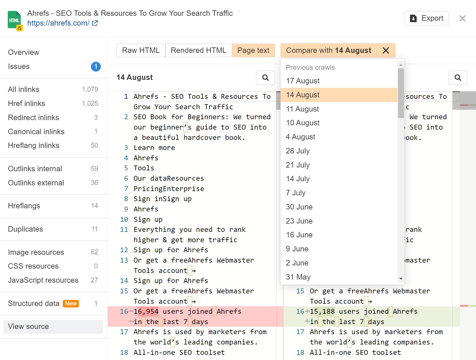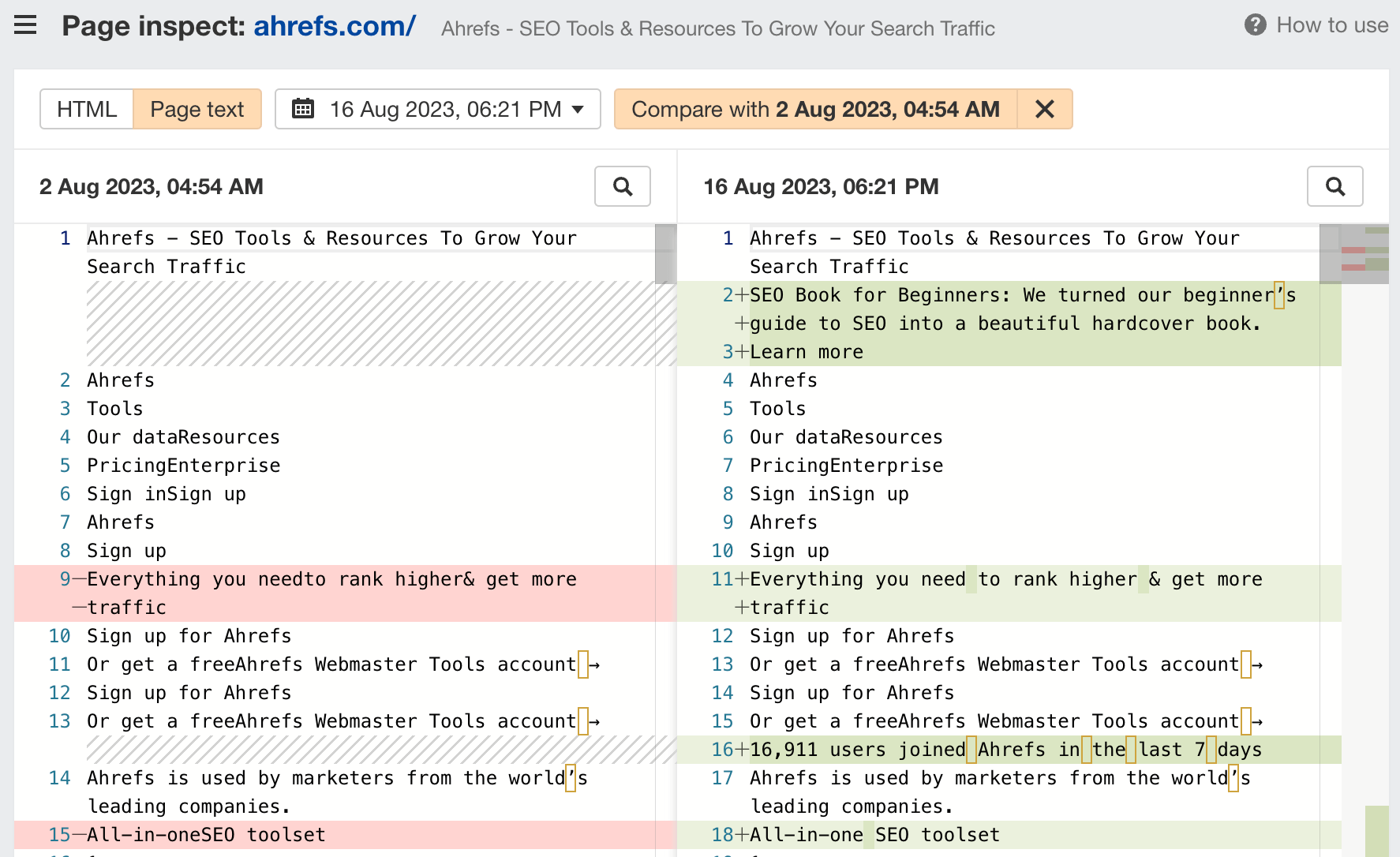 This tool in Site Explorer lets you see the full history of changes on a given page for both text content and HTML. Use it to analyze the on-page tactics of your competitors and see the changes they made to their existing page before it started ranking better in Google.