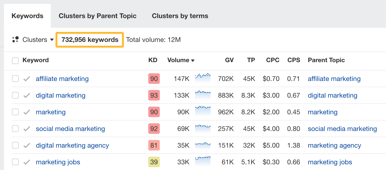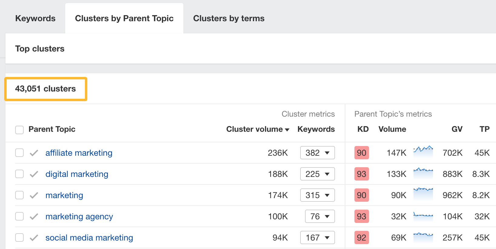 Instantly cluster by parent topic or by terms in all keyword ideas reports in Keywords Explorer, as well as in the keyword list overview.