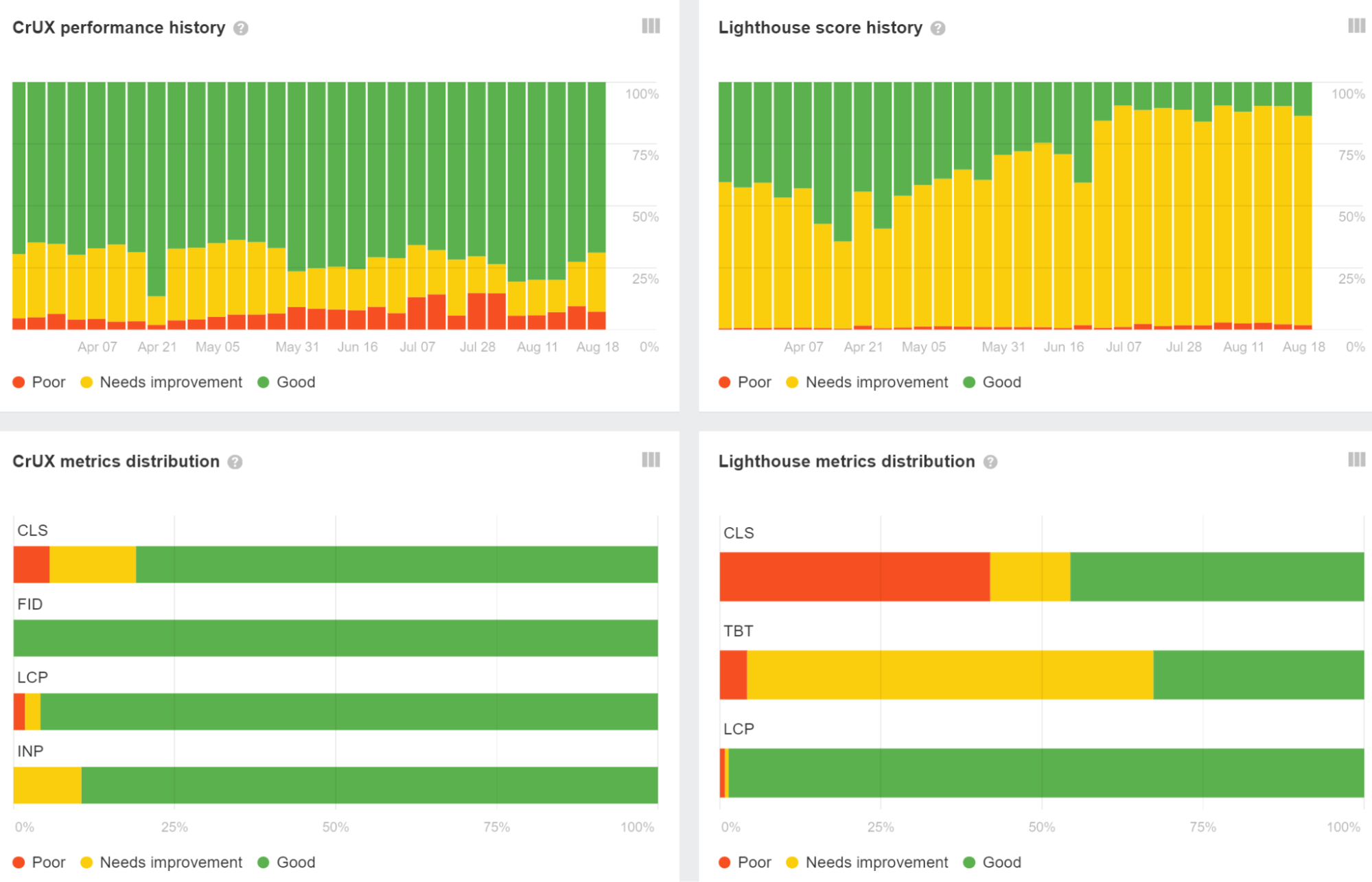 - Core Web Vitals: Many tools only show Lighthouse data. Site Audit gives you that, along with page-level CrUX data for all metrics, as well as INP which is replacing FID – all laid out in beautiful dashboards for ease of visualization and reporting.