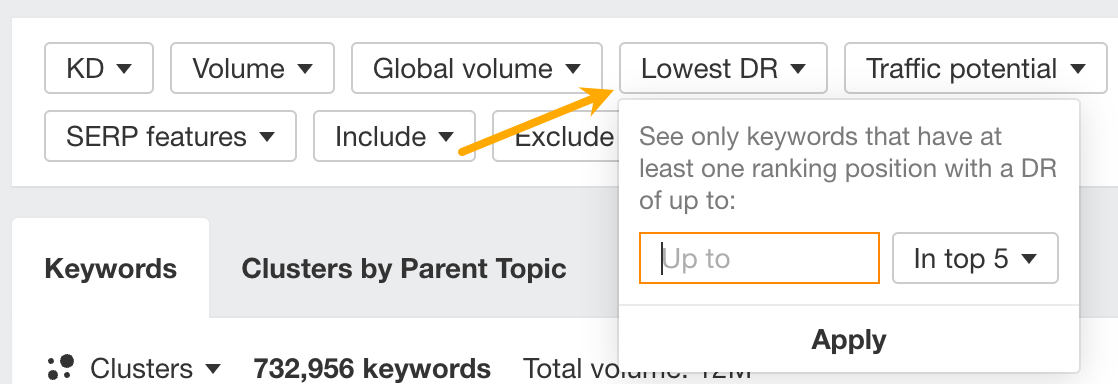 This filter in Keywords Explorer lets you find high-difficulty keywords which a “weaker” website ranks for. This indicates that even though websites with high Domain Ratings are currently ranking in the SERPs, there’s still a window of opportunity for a “smaller” website to rank.