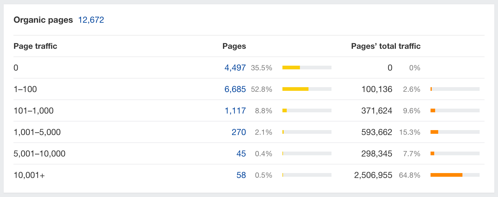 - Organic pages widget: instantly get an idea of how search traffic is distributed, how many top-performing pages there are, and how many pages don’t generate any significant traffic.
