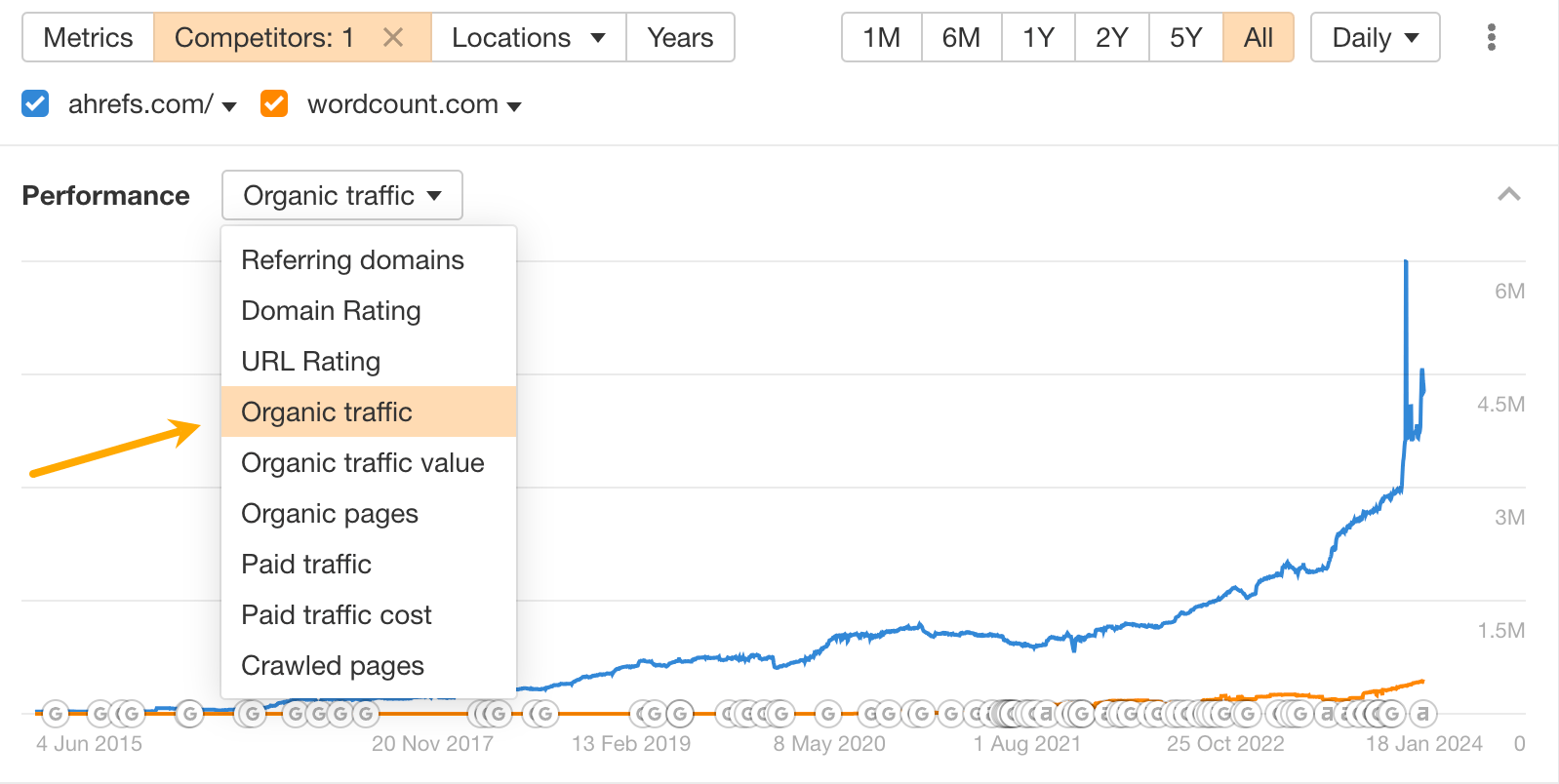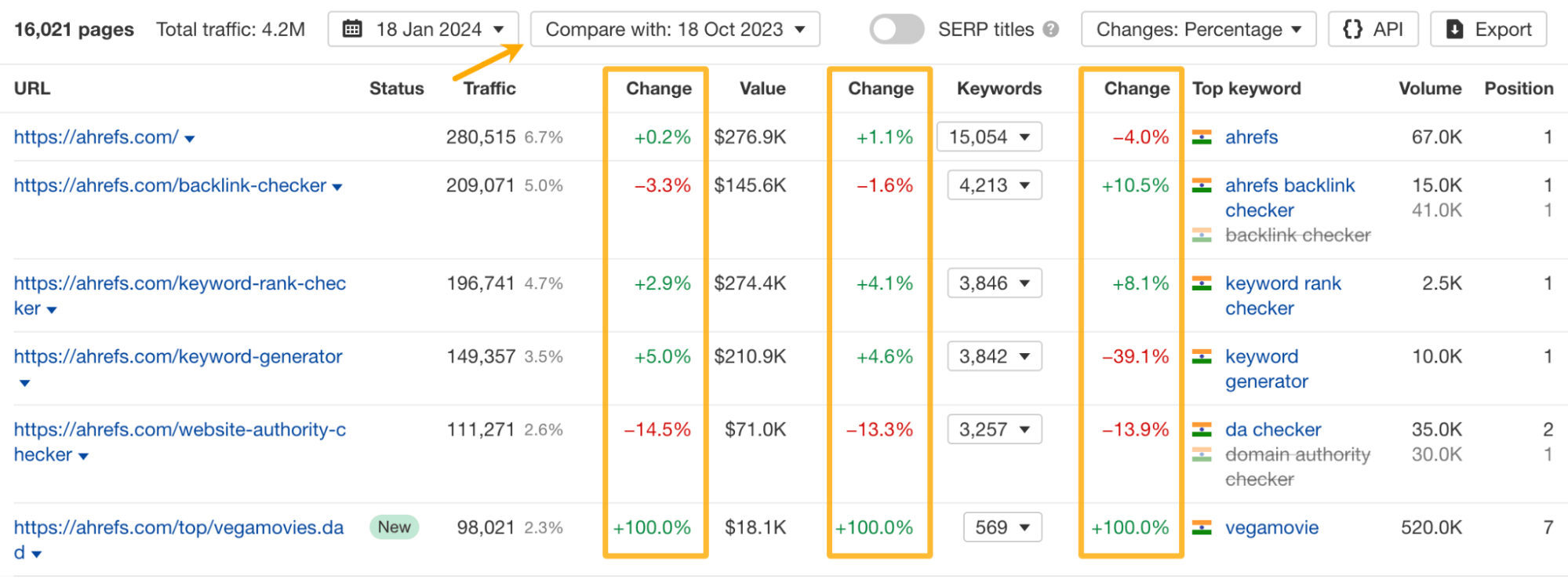 You can compare data between any two dates in most Site Explorer 2.0 reports. This is perfect for digging into spikes and dips in traffic or backlinks which happened at any point.