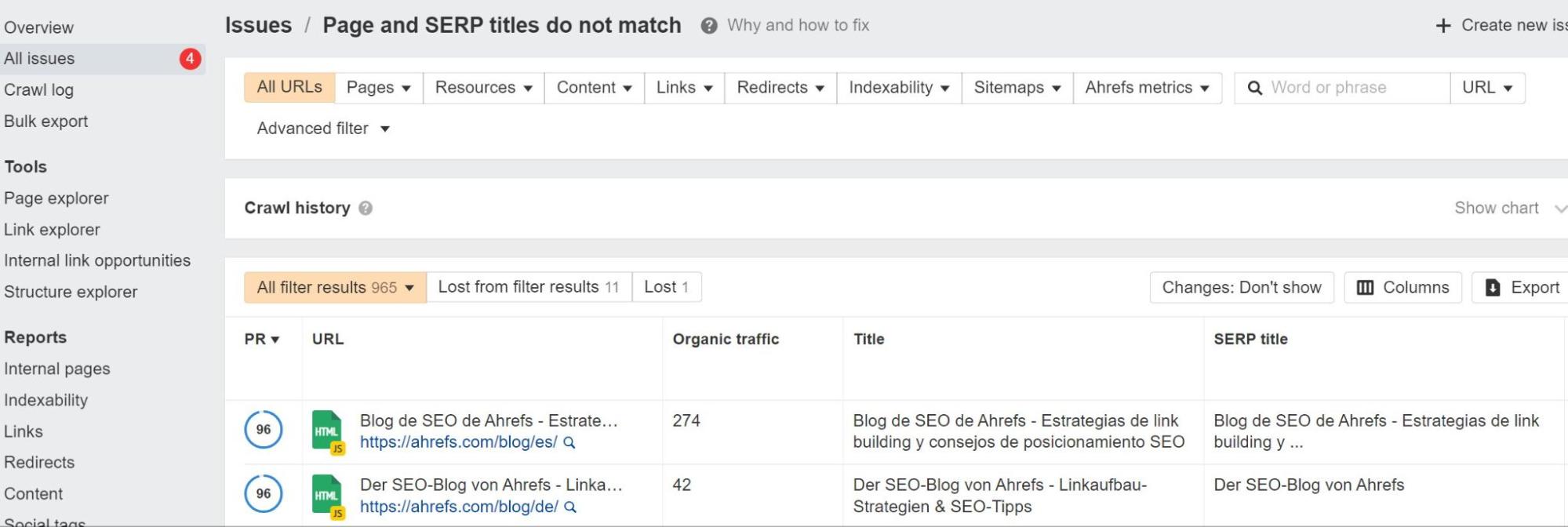 - Page & SERP Title don’t match: We’re more than just a tool to audit your website – we pull data from other sources like SERPs and Ahrefs data to show some interesting issues like this one. You may want to improve the page title if it’s not relevant to the page since it is a ranking factor.