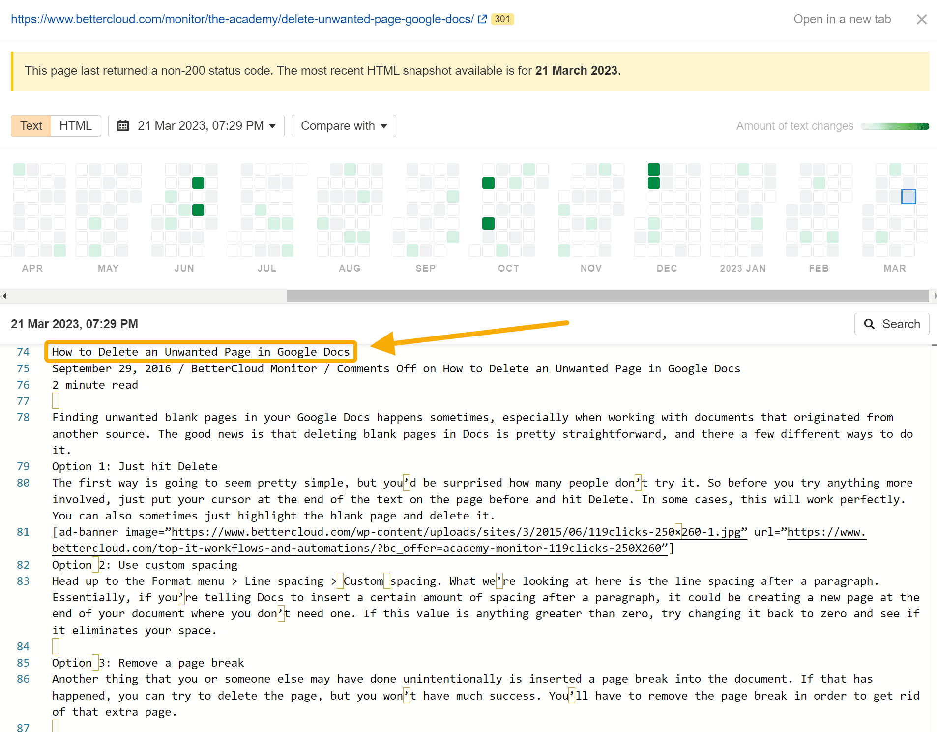 The pages in the subfolder are now deleted, but by using Ahrefs’ Page Inspect feature, it’s possible to look at a snapshot of some of the pages’ HTML content.