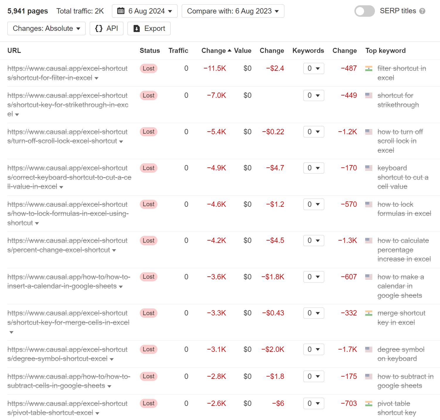 This is a list of the SaaS companies that had the greatest estimated monthly organic traffic loss from August 2023 to August 2024.