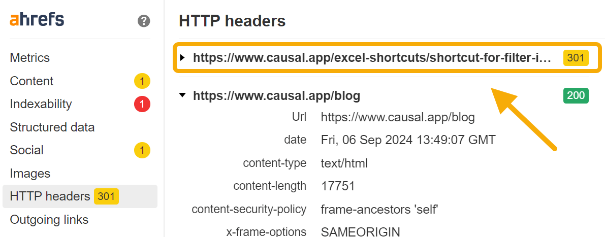 As the Ahrefs SEO Toolbar shows, the offending blog posts are now 301 redirected to the company’s (now much better, much more human-looking) blog homepage: