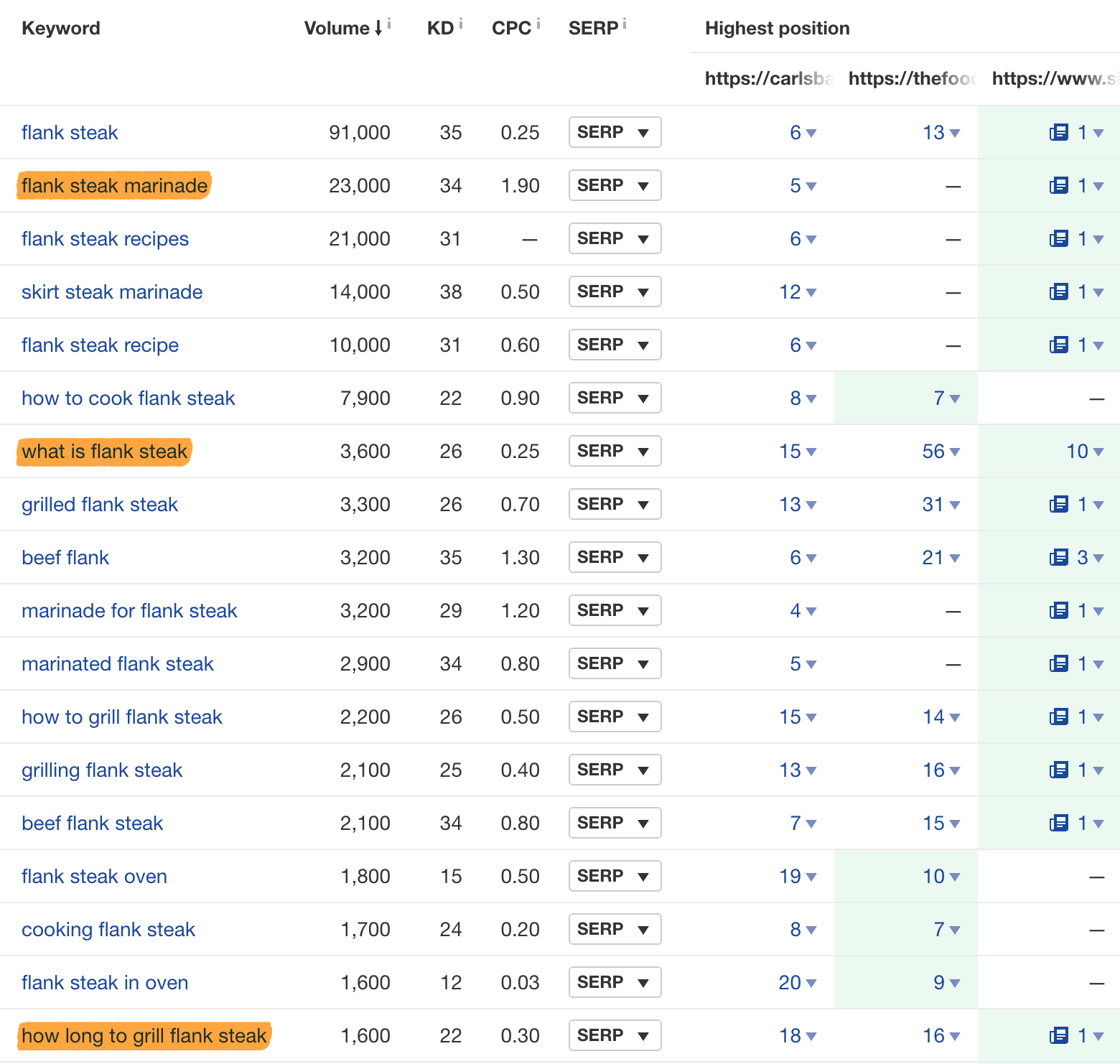 In this case, many of the keywords are just different ways of searching for our main keyword. But there are a few that map to subtopics like “what is flank steak,” “flank steak marinade,” and “how long to grill flank steak.”