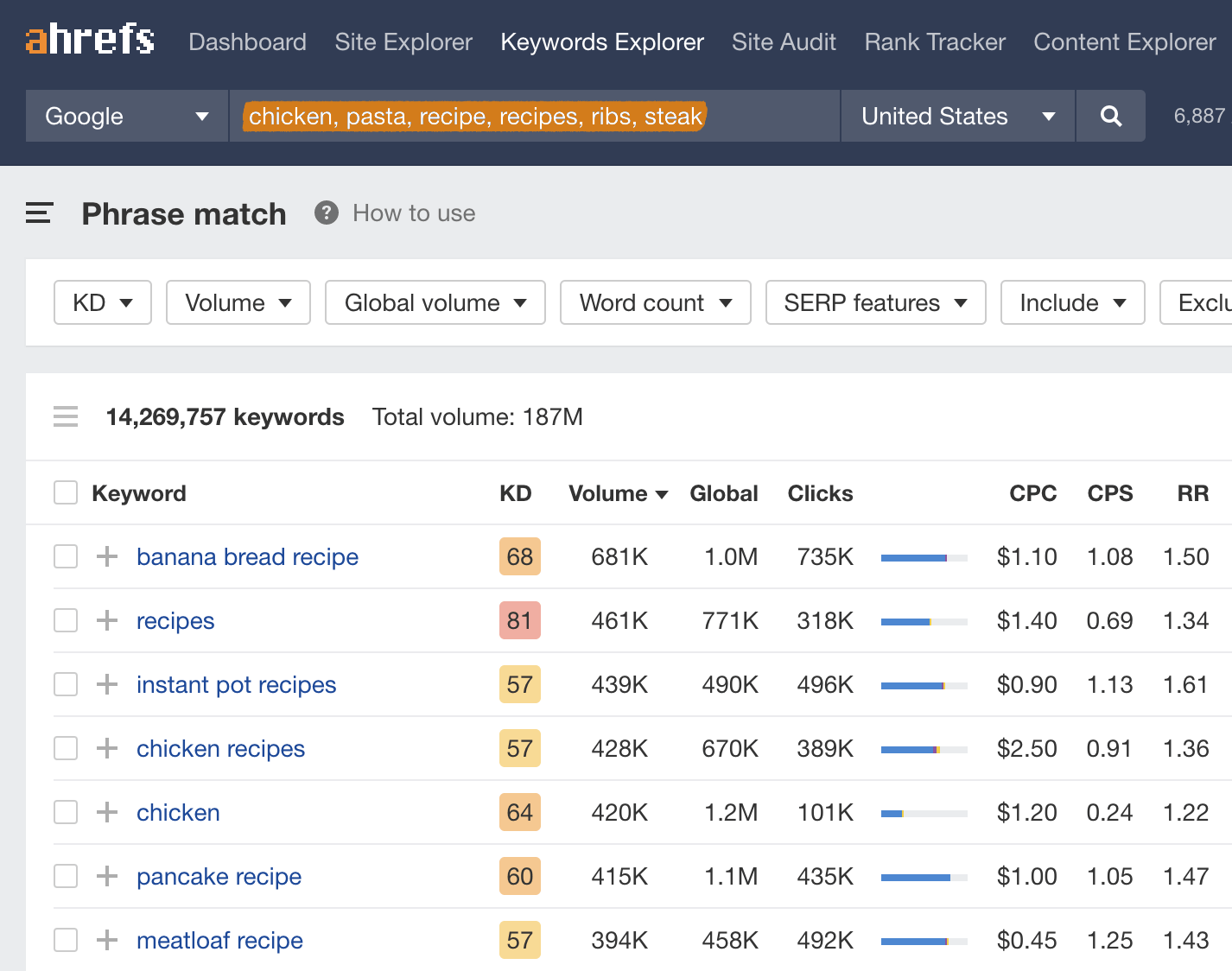 Keywords Explorer finds over 14 million keywords containing one or more of these phrases, but it won’t make sense to write blog posts about them all. You need to skim the list for topics that make sense for you.