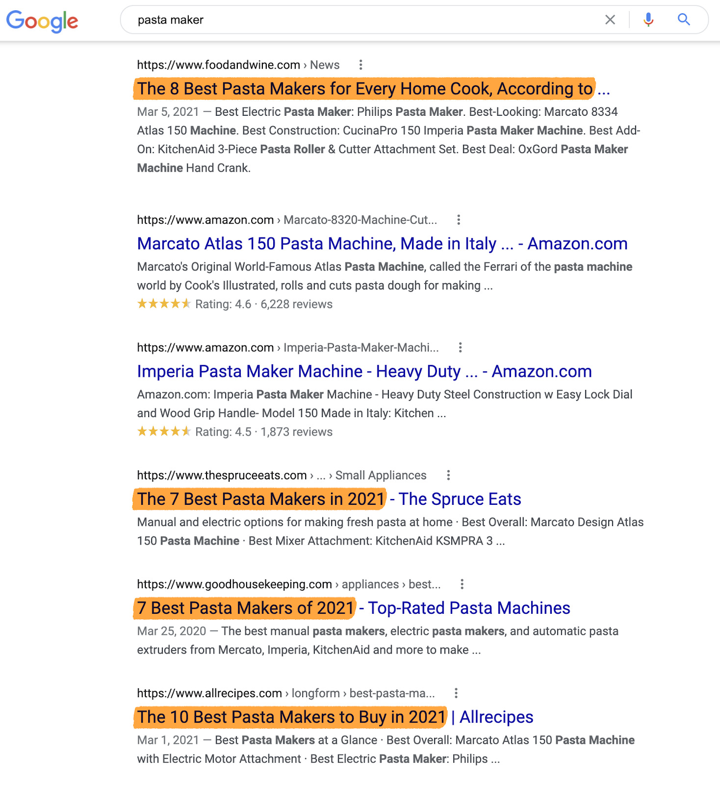 You might assume that it wouldn’t make sense to write a blog post about this because people are undoubtedly looking to buy pasta makers. Yet if you look at the search results, most of them are blog posts reviewing the best pasta makers.
