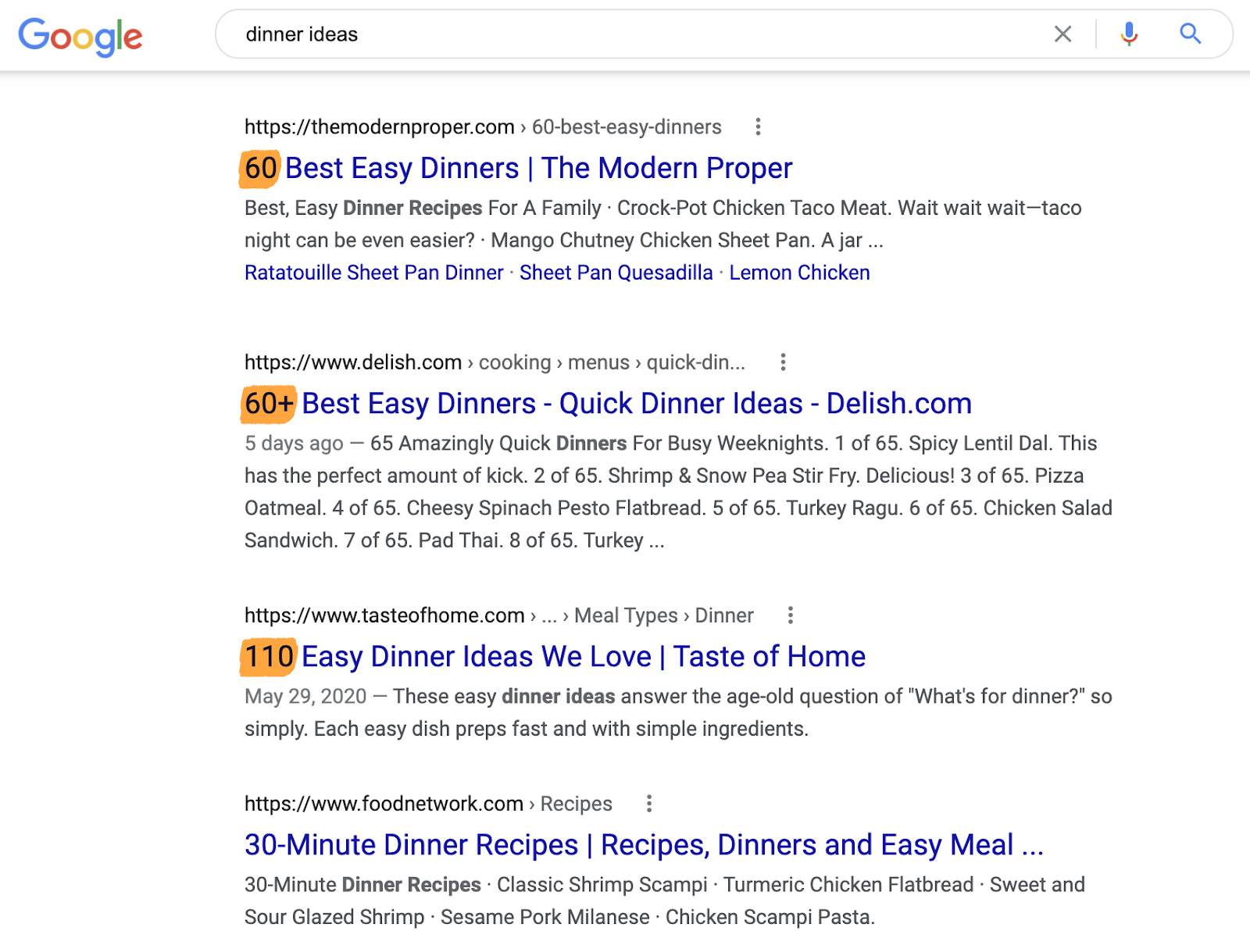 For example, people searching for “flank steak” clearly want a recipe that includes a marinade. If you want to rank, it’s probably worth giving people what they want instead of just telling them to season with salt and pepper and throw it in a pan.
