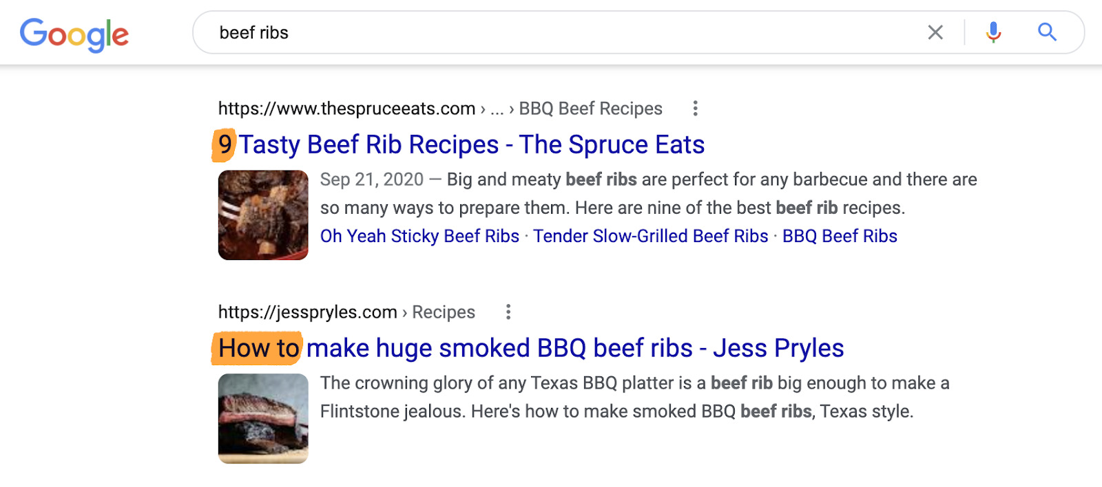 Are things always this straightforward and obvious? Of course not. Sometimes there will be an even mix of multiple content formats in the results, as is the case for “beef ribs.”