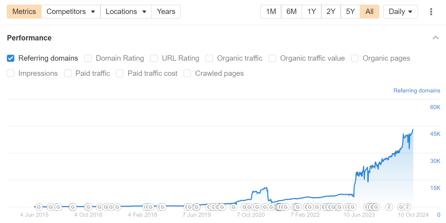 I usually start with the Overview report in Site Explorer to get a quick overview of the website’s referring domain growth. Here’s the chart for our #1 company, Elfsight: