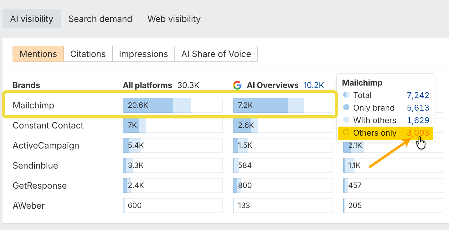Then go to Mentions, hover over your brand, and pick Others only to spot AI mention gaps.
