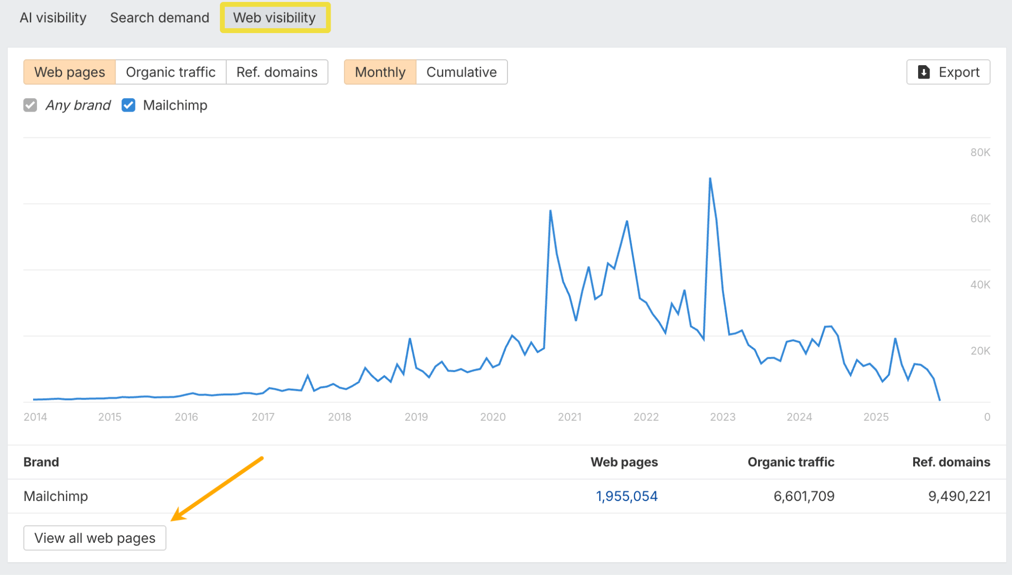 That’s why Ahrefs Brand Radar gives you insights into your brand’s search demand: the sum of all the search volumes from the keywords mentioning your brand (in Google).