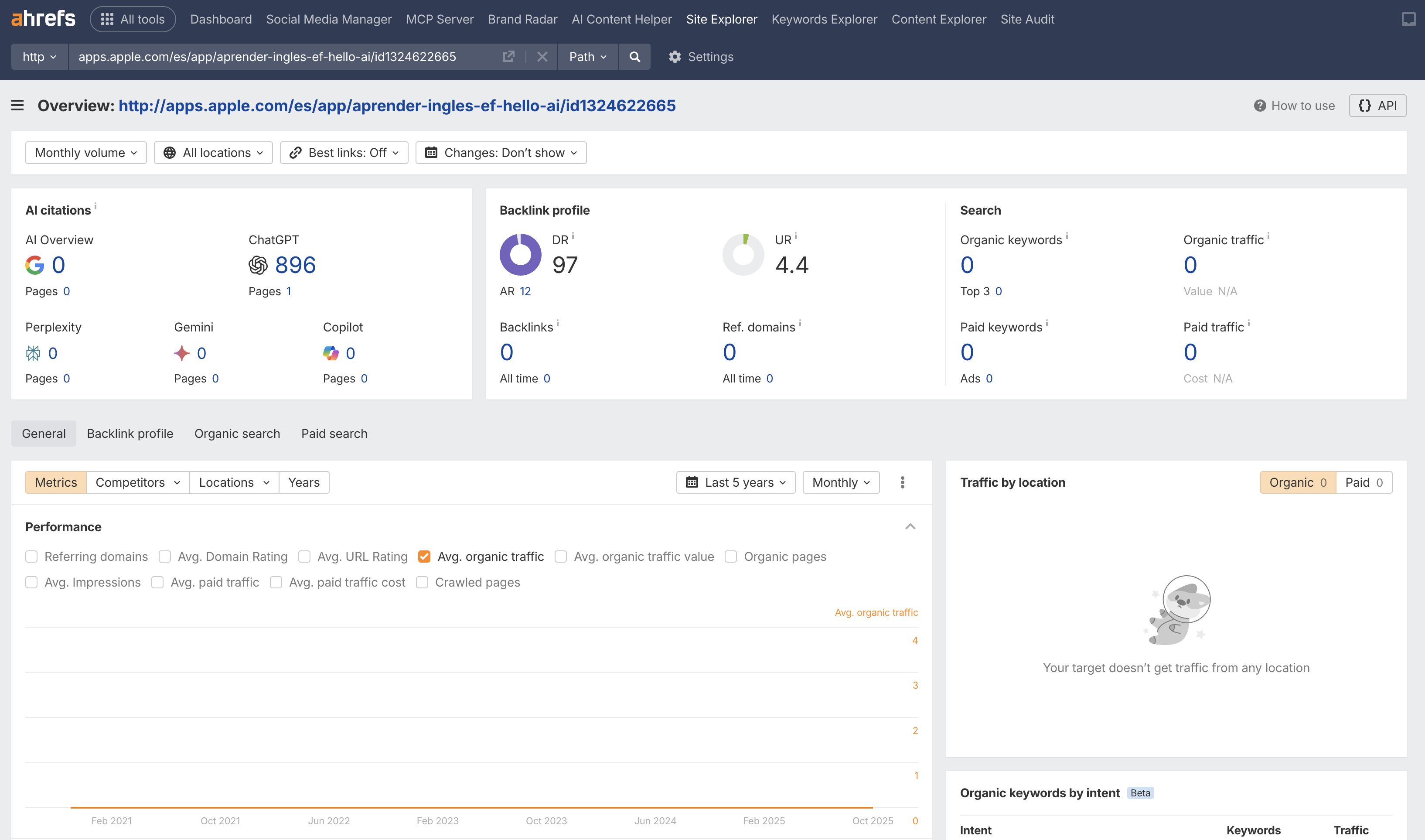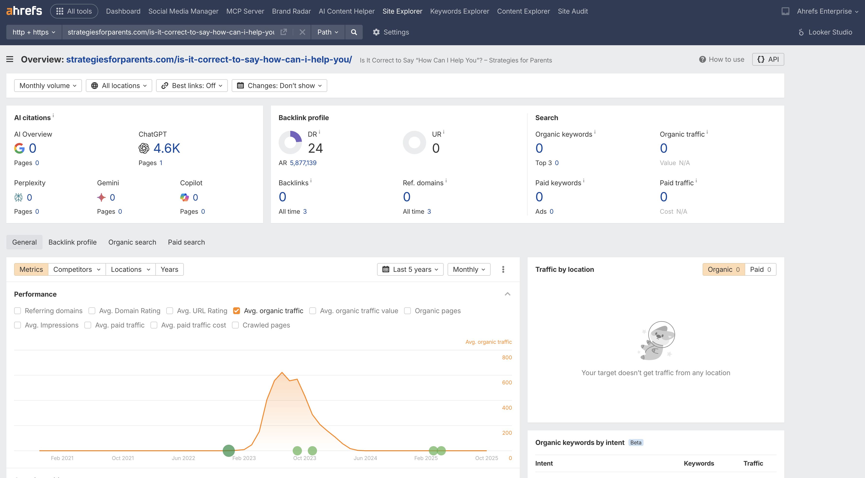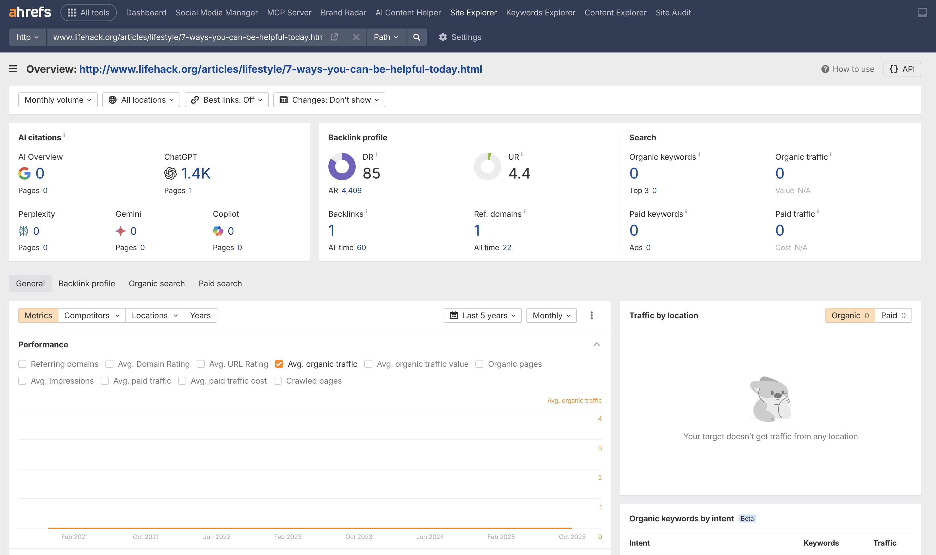 Then there’s this article from Lifehack on “7 ways you can be helpful today”. It is cited 1.4K times in ChatGPT, but has never gained any organic keywords or traffic.