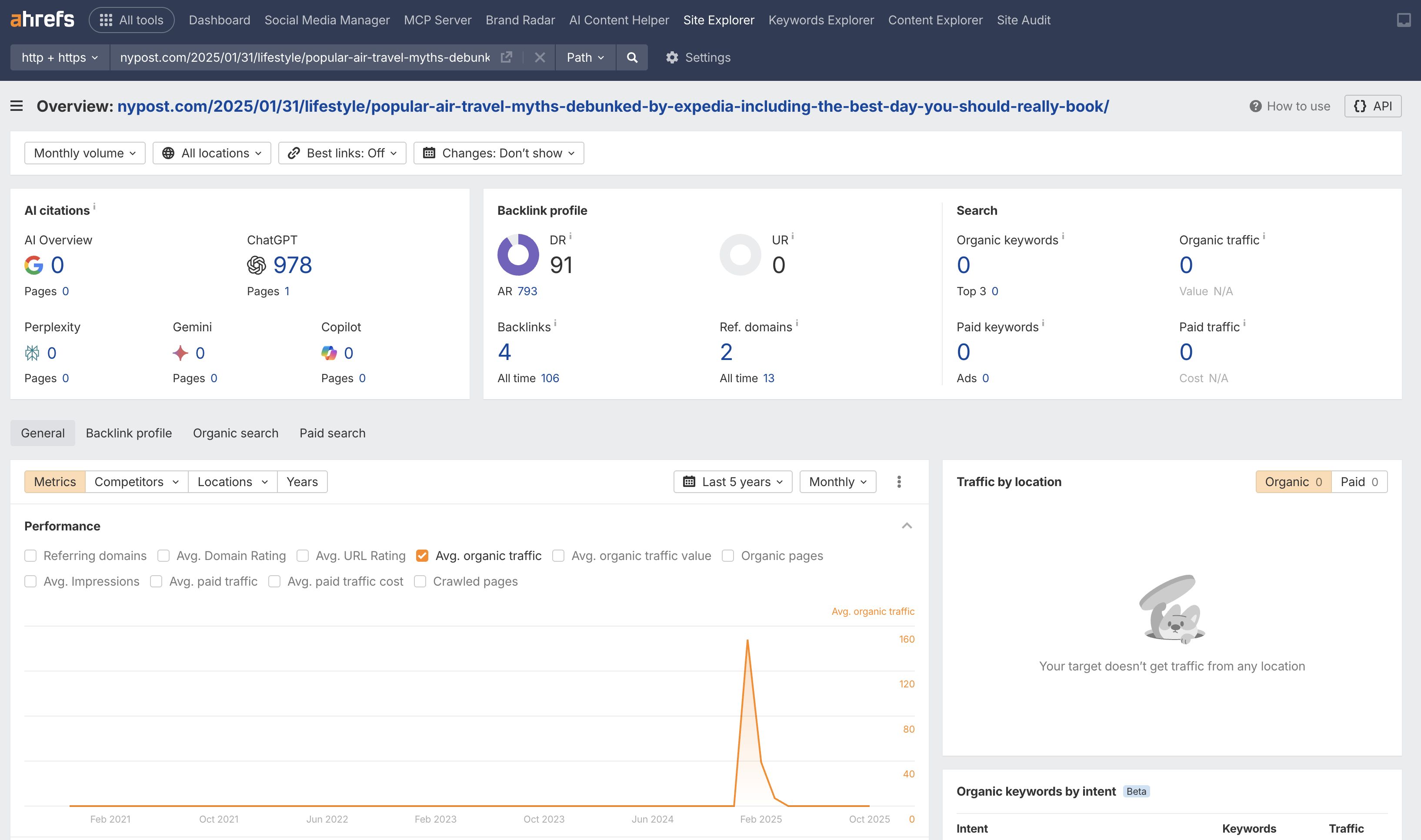 And then there were a few pages with zero search visibility, but respectable ChatGPT presence, from news media sites like New York Post and Condé Nast Traveller.