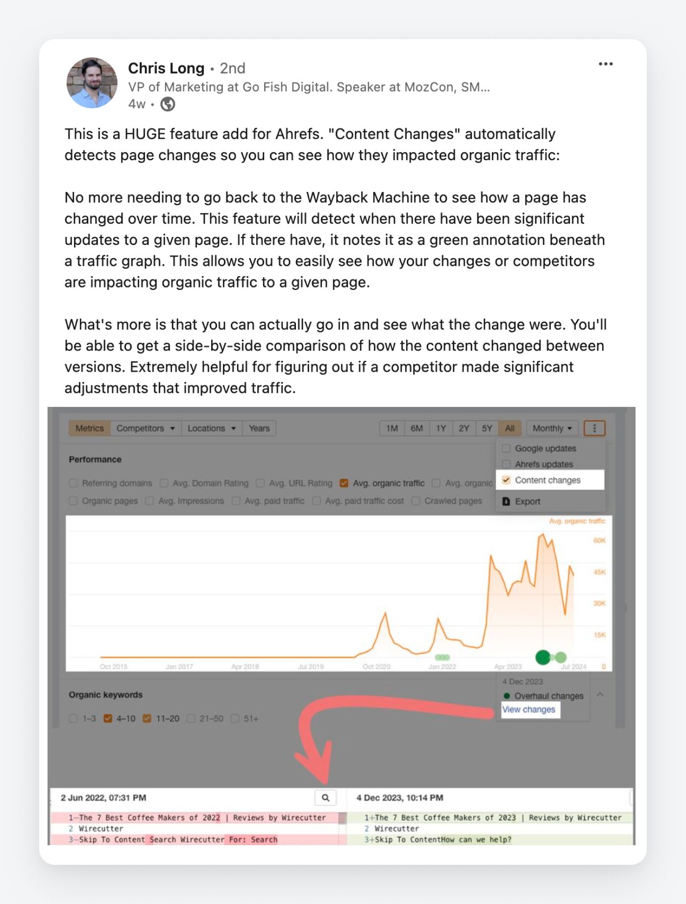 This allows you to compare historical changes made to a page at two different dates and uncover what exactly might have caused traffic fluctuations.