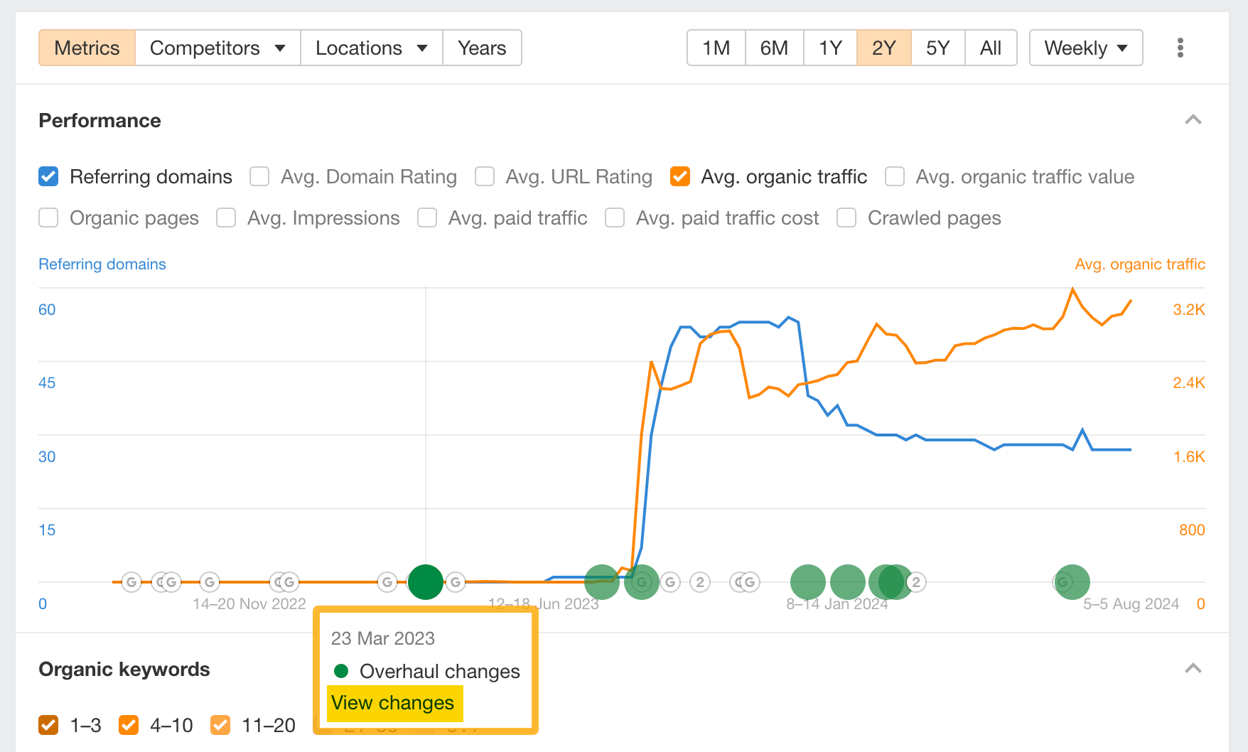 These will be displayed as green bubbles right next to the Google Algorithm updates at the bottom. If you hover over them, you’ll see the extent of content changes made on a page (moderate/major/overhaul) and their influence on the traffic numbers.