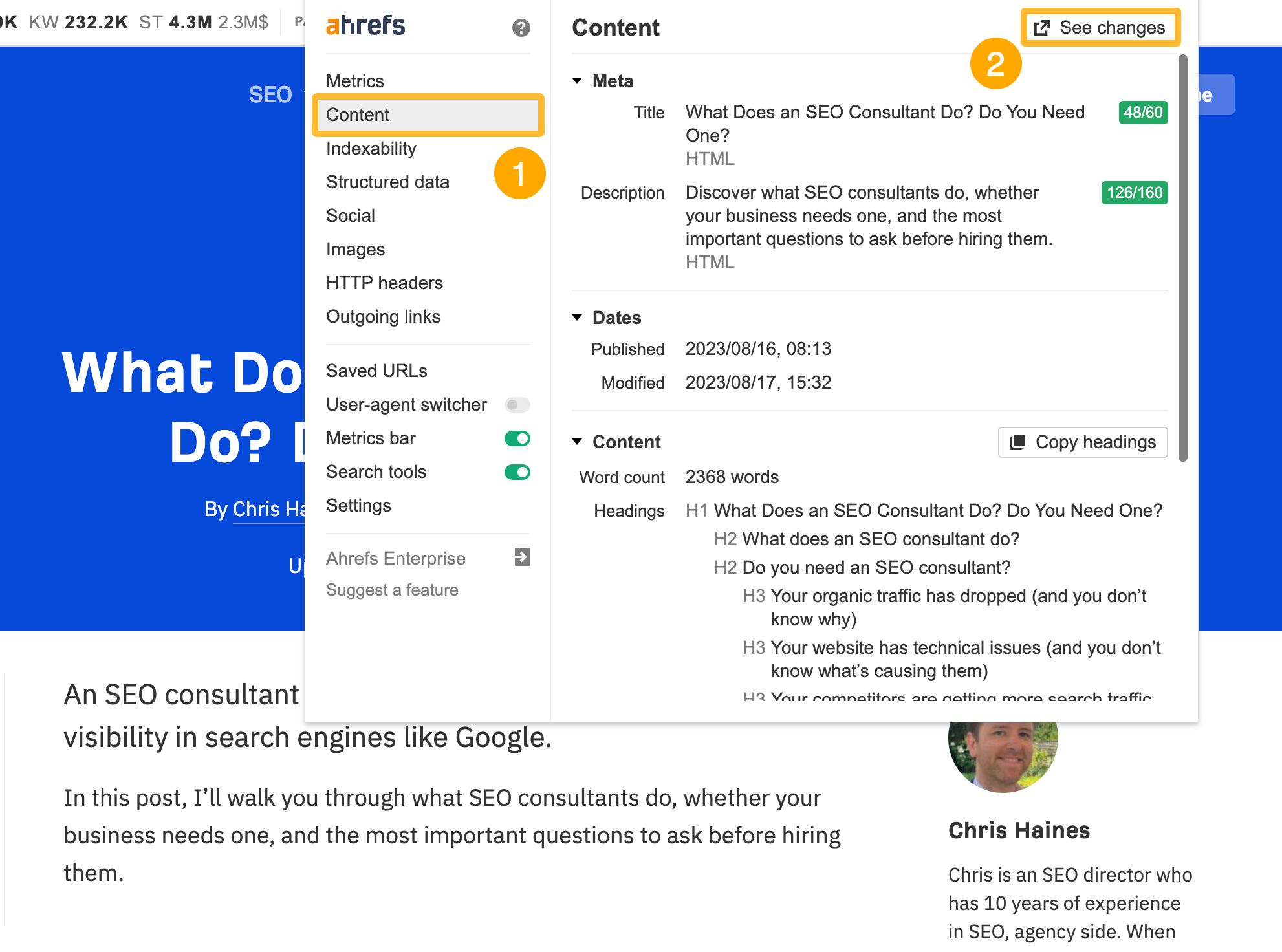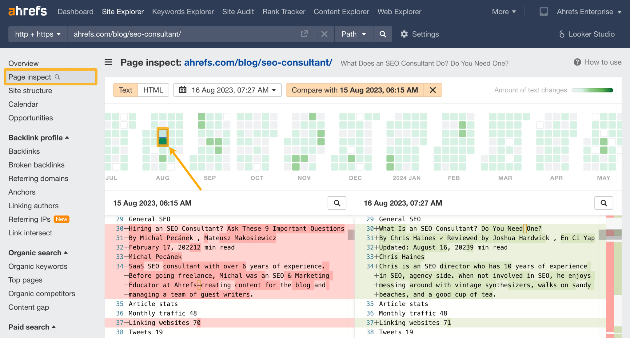 For a deeper analysis, click on View changes to open the Page Inspect tool and compare the content changes side-by-side to see exactly what changed.