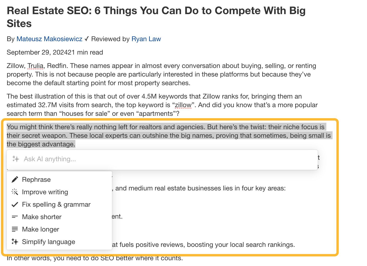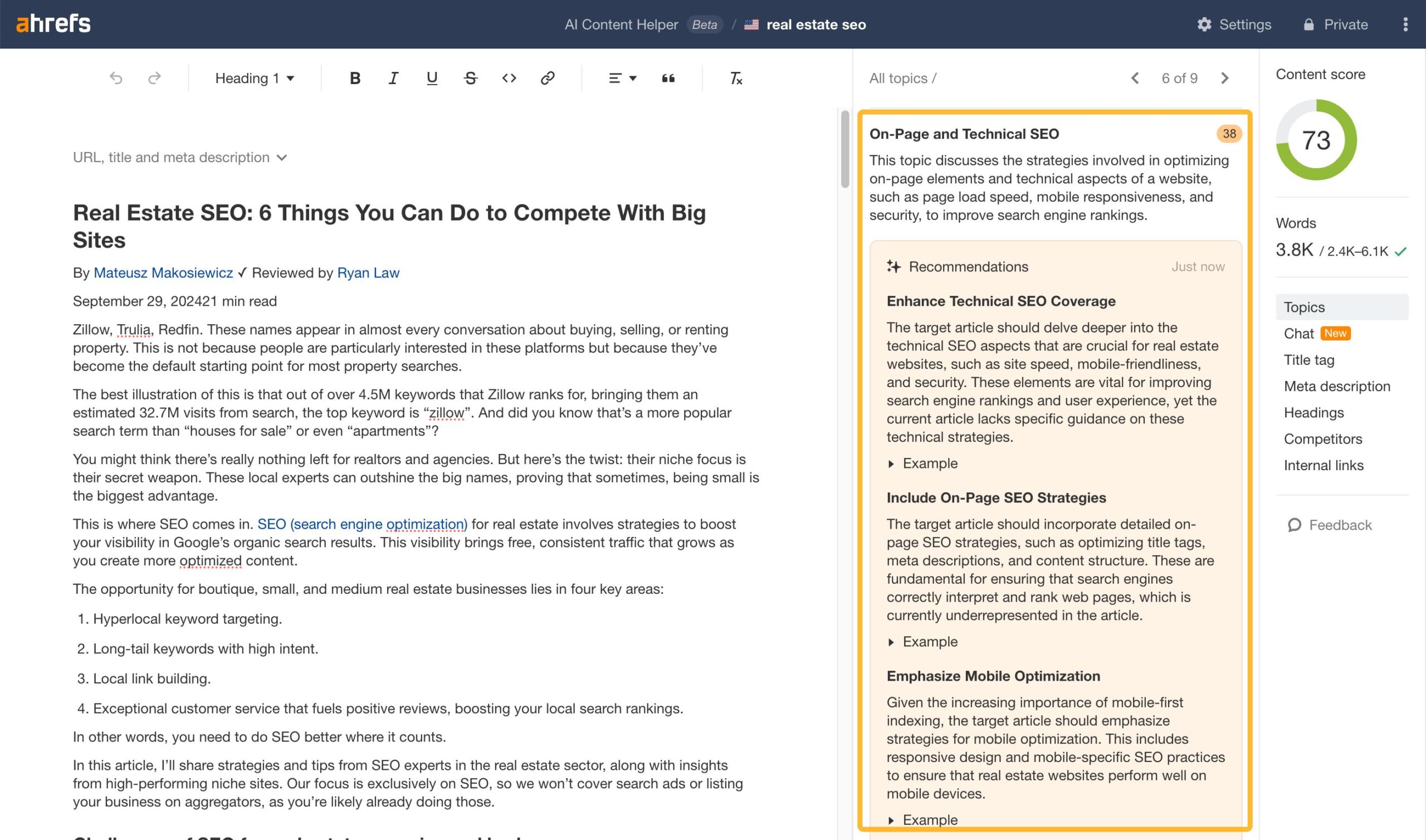 But instead of manually combing through competitor content, use a tool like Ahrefs ‘AI Content Helper to systematically identify what’s missing from your content and get specific recommendations on how to improve it.