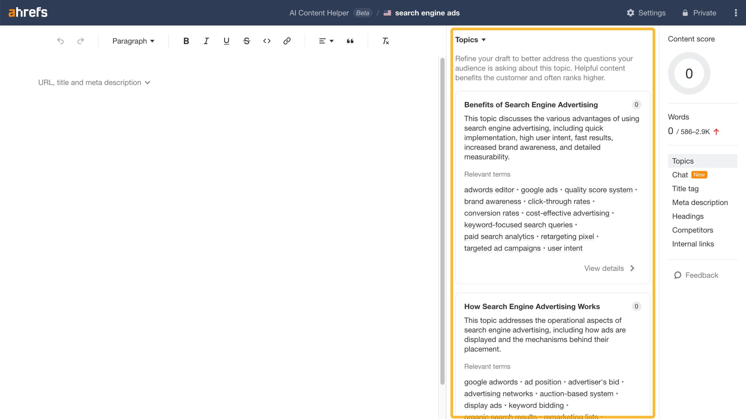 You can use the tool for both updating old content and creating something new. When starting fresh, it recommends key topics to include in your outline so you cover everything important.
