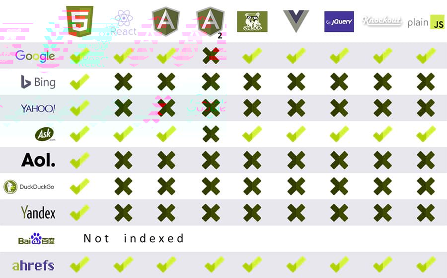 Google and Ask were the only search engines that were able to execute JS from most of these frameworks:
