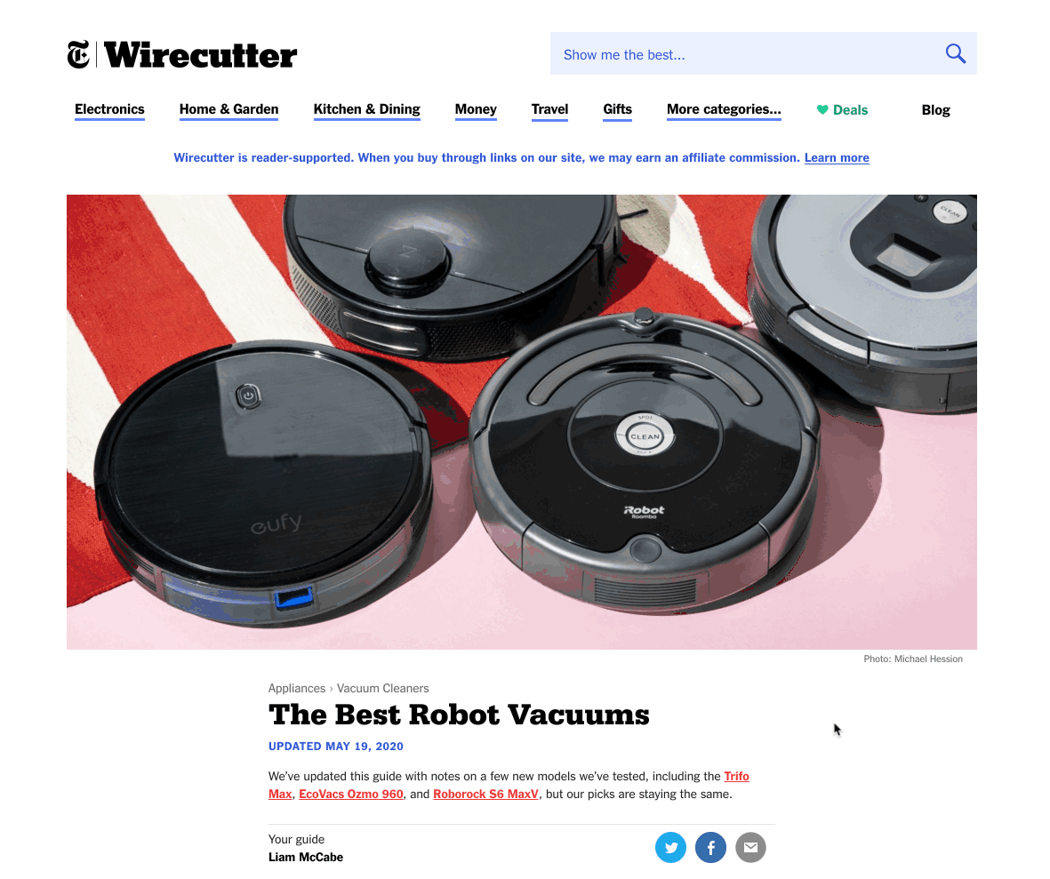 Bei Partner-Websites von Amazon sind die besten „Geld“-Seiten in der Regel Produktzusammenfassungen. Sie sind diejenigen, die die besten Produkte in einer Kategorie auflisten. Wie z.B. diese Liste der besten Saug-Roboter von The Wirecutter :