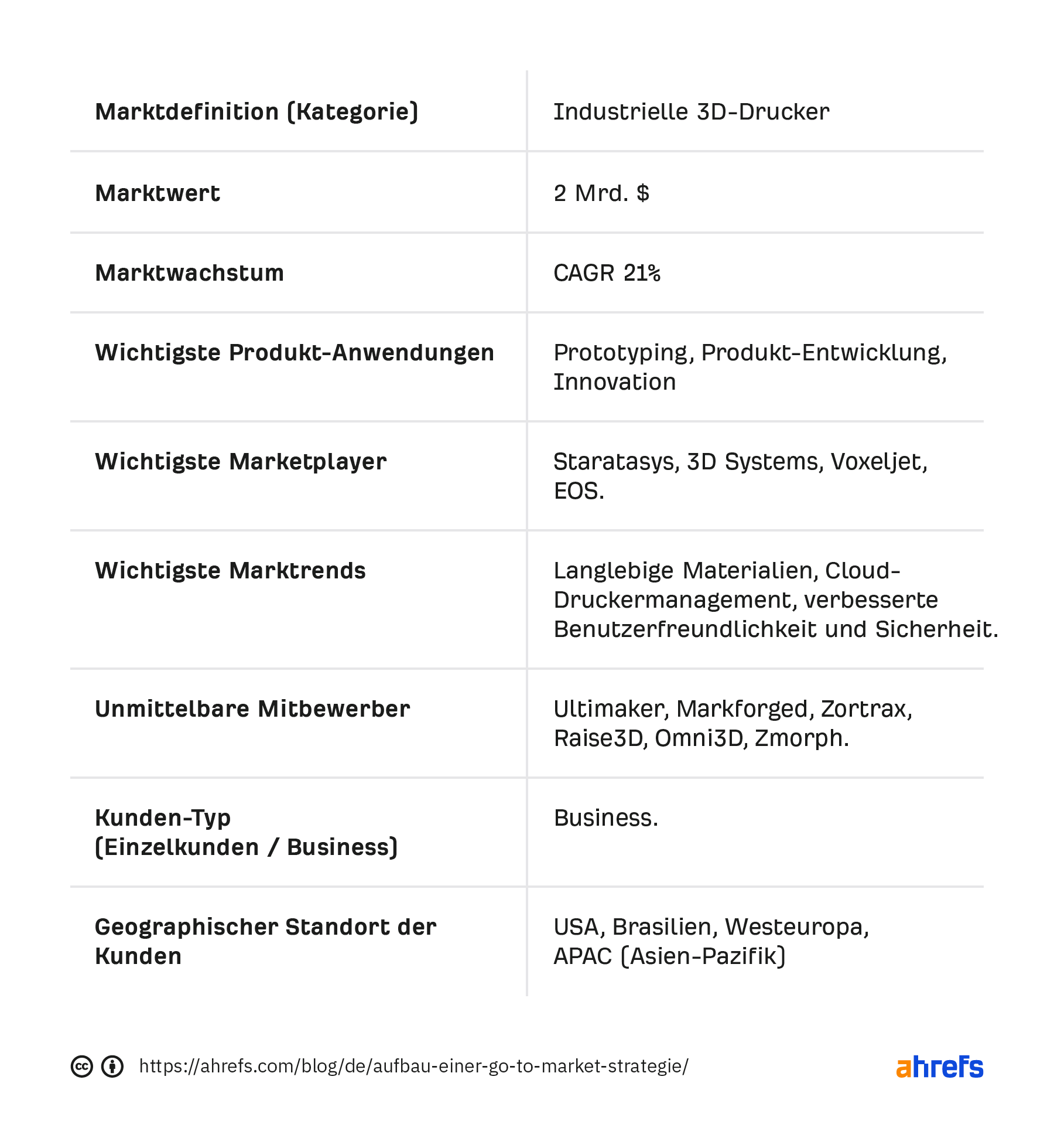 Um die wichtigsten Ergebnisse der Marktforschung zusammenzufassen, kannst du die folgende Tabelle verwenden. Wir haben sie mit Dummy-Daten für die 3D-Druckbranche ausgefüllt. Wenn du sie auf der Grundlage deiner Forschung ausfüllen kannst, bist du bereit für den nächsten Schritt des GTM-Prozesses.