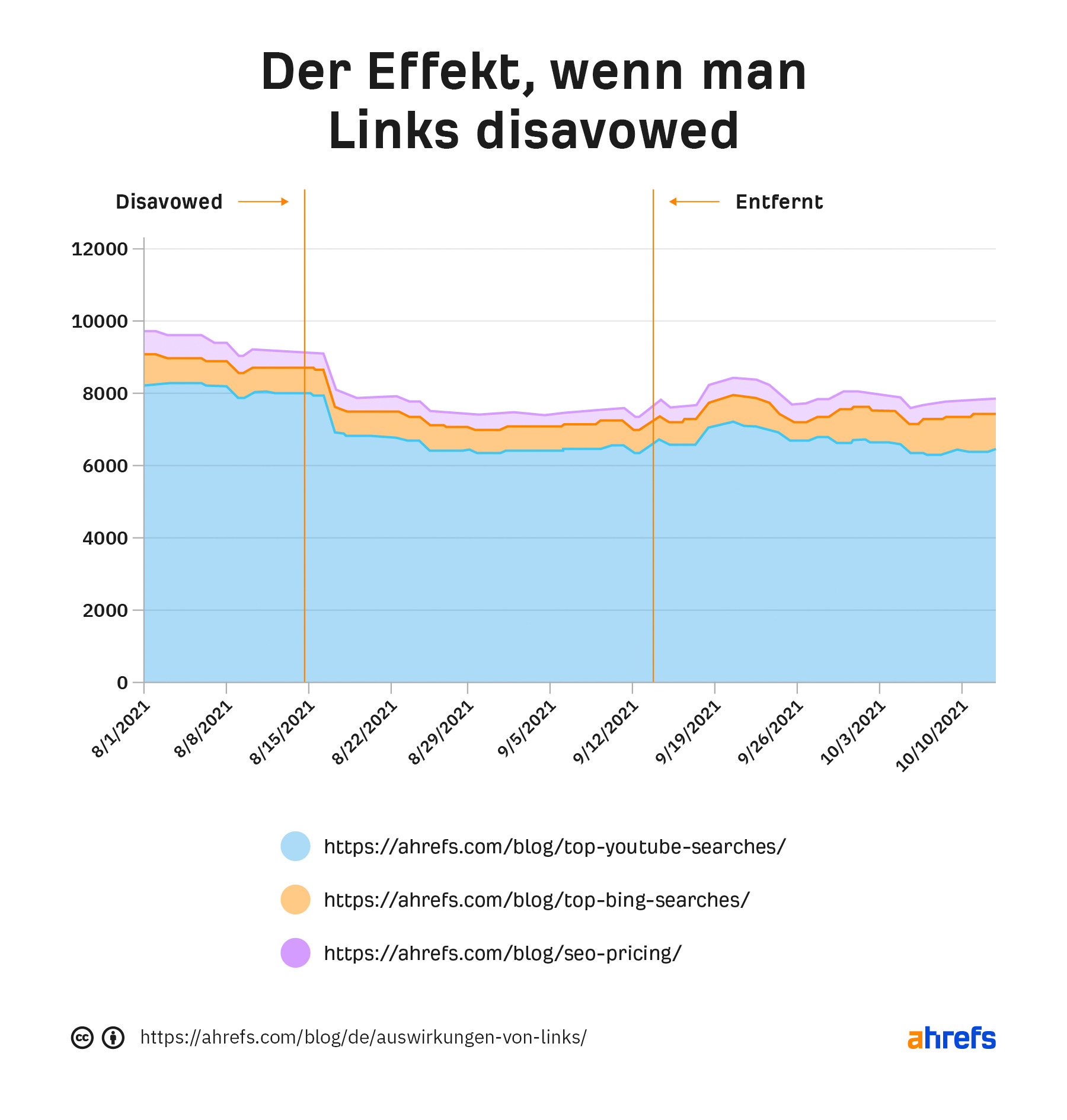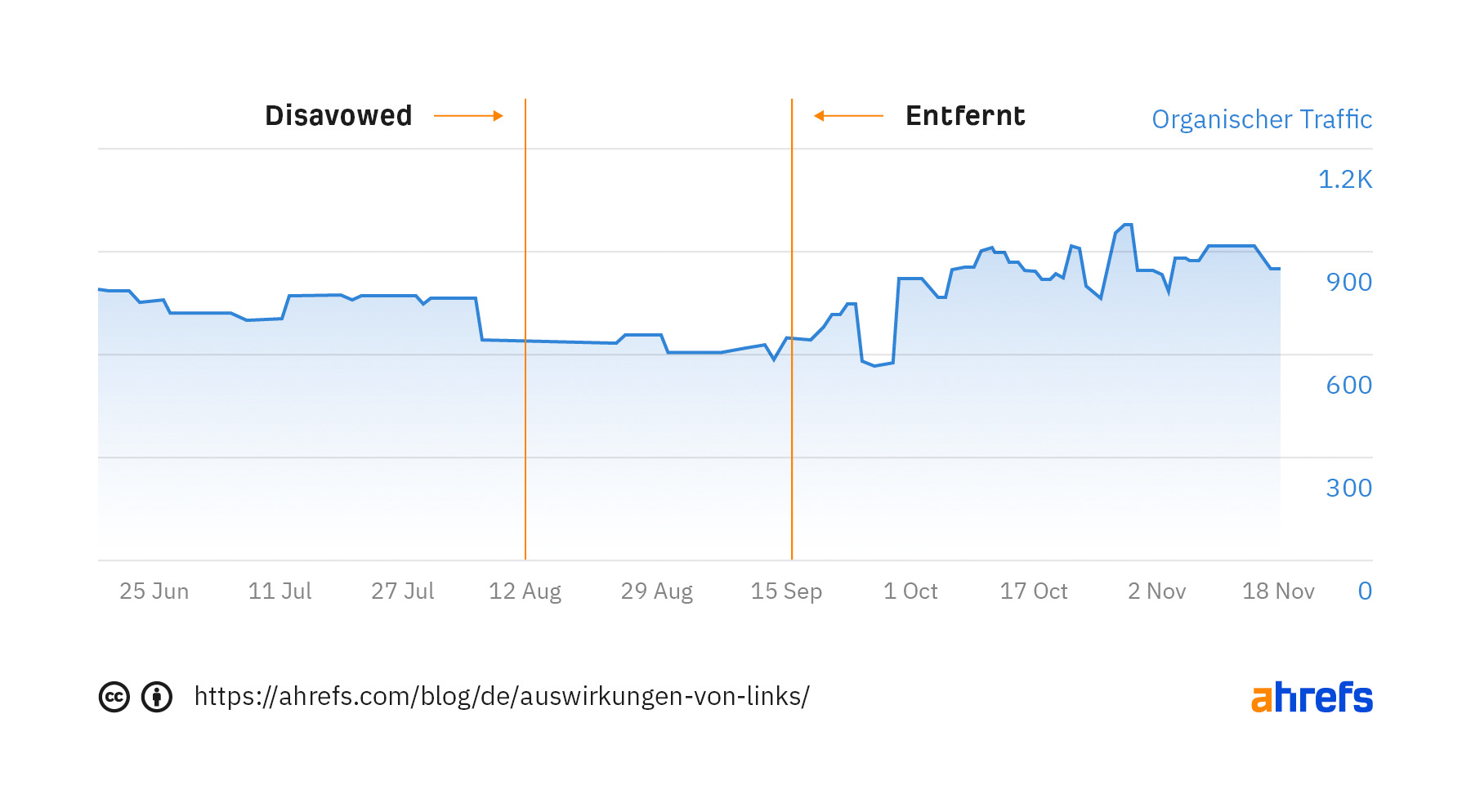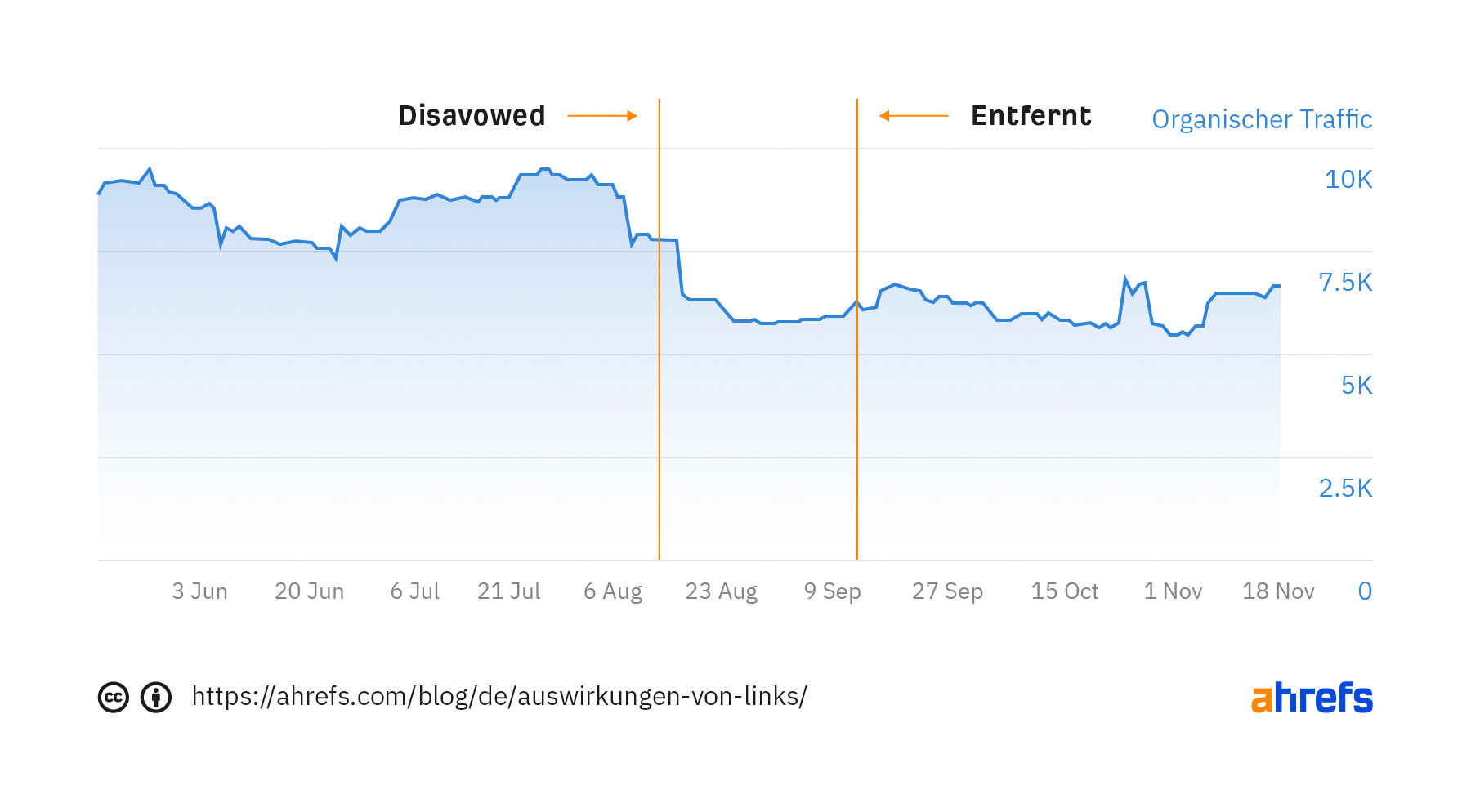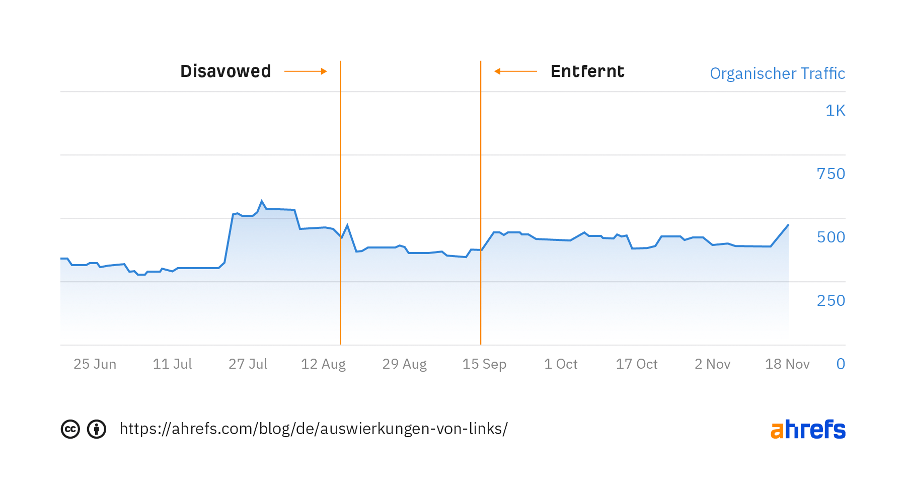 Spoiler-Alarm: Links sind immer noch wichtig. Der Traffic und die gerankten Keywords sind gesunken, nachdem ich die Links disavowed habe, und gestiegen, nachdem ich die disavow-Datei entfernt habe.