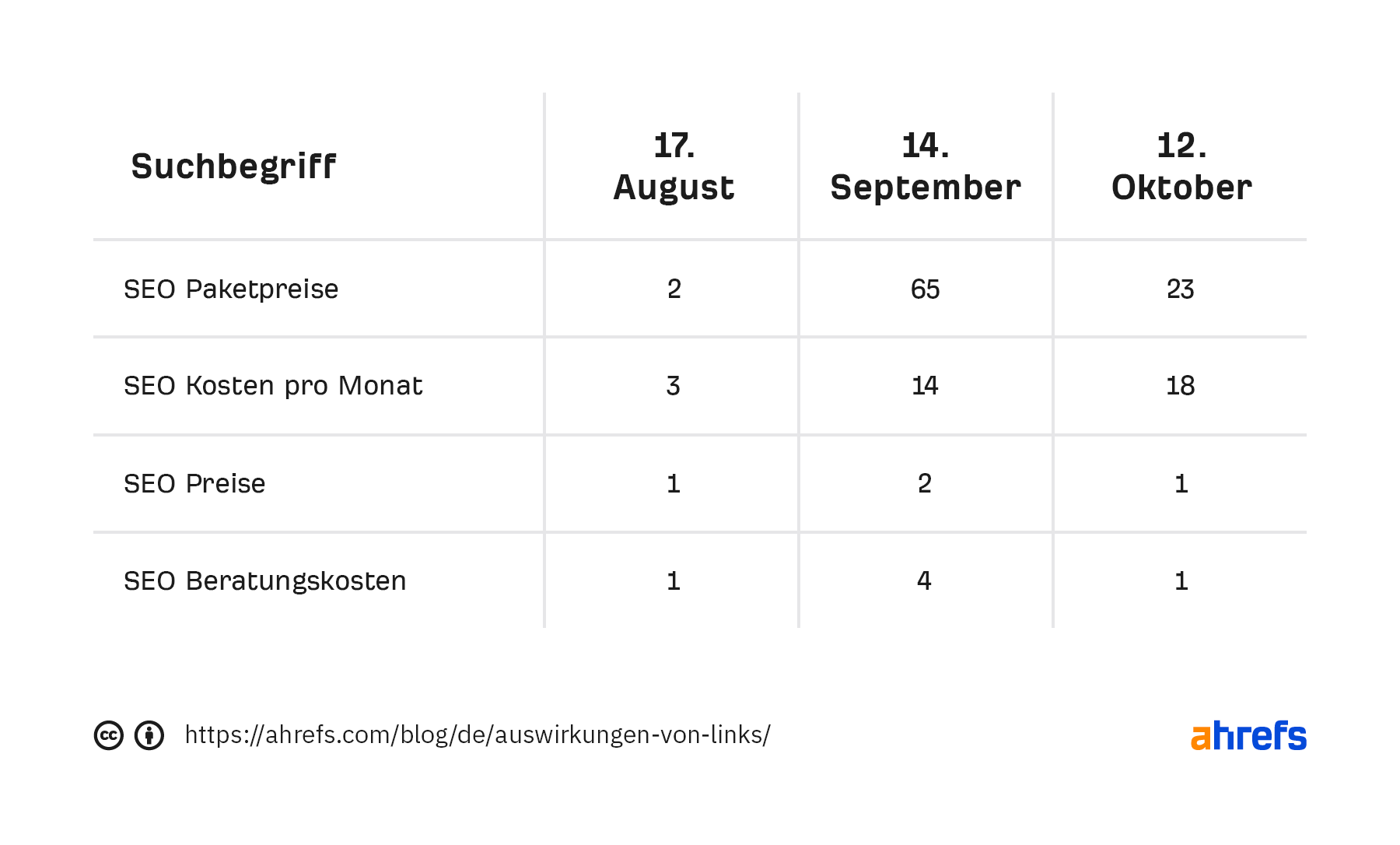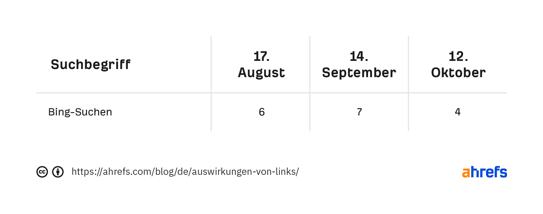 Anstatt Links zu Seiten aufzubauen, dachte ich mir, dass es am einfachsten wäre, die Links zu einer Seite zu entfernen und zu sehen, was passiert. Mit Hilfe von Joshua Hardwick, dem Leiter der Content-Abteilung bei Ahrefs, wählten wir drei Artikel aus und disavowed einen Monat lang alle Links zu diesen Seiten, wodurch der Wert der externen Links verloren ging. Einen Monat später entfernte ich sie aus der Disavow-Datei, wodurch der Wert der Links wiederhergestellt werden sollte.