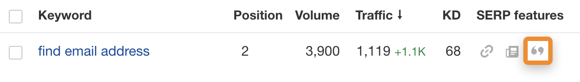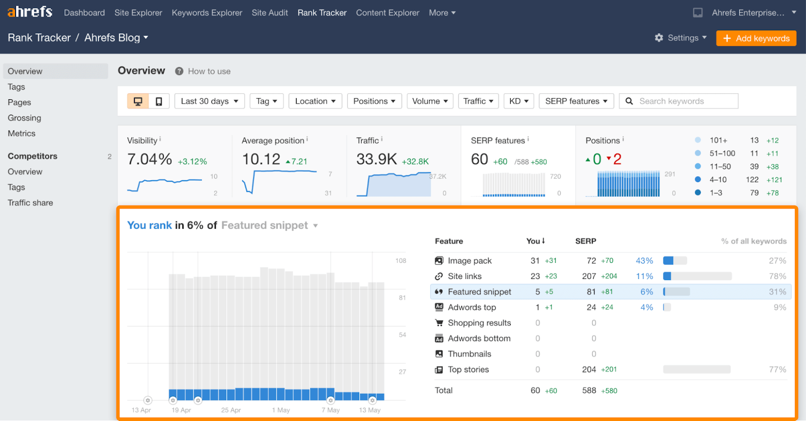 Viele Rank Tracker bieten dir diese Möglichkeit, wie z.B. der Rank Tracker von Ahrefs, der automatisch die Prominenz und den Besitz der meisten SERP-Features für getrackte Keywords verfolgt.