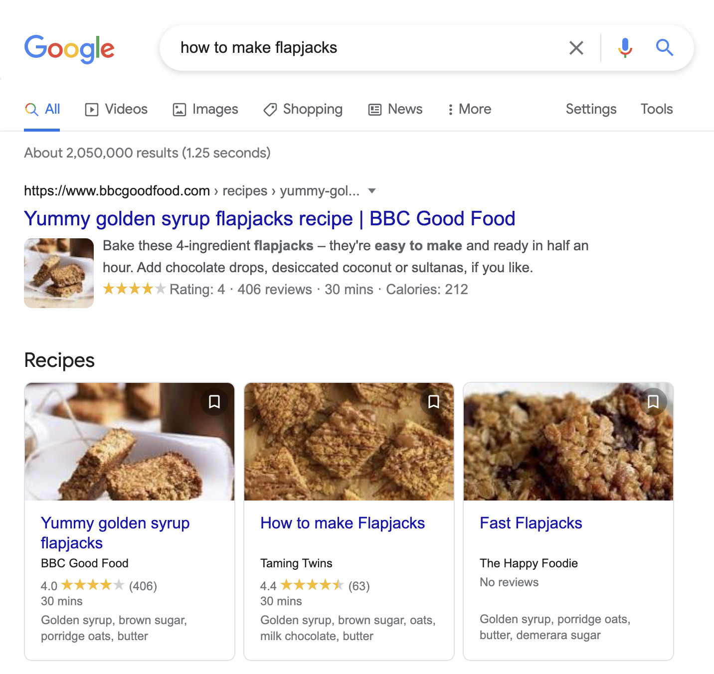 Dies sind zum Beispiel die Suchergebnisse für “wie man Flapjacks macht” in Großbritannien:
